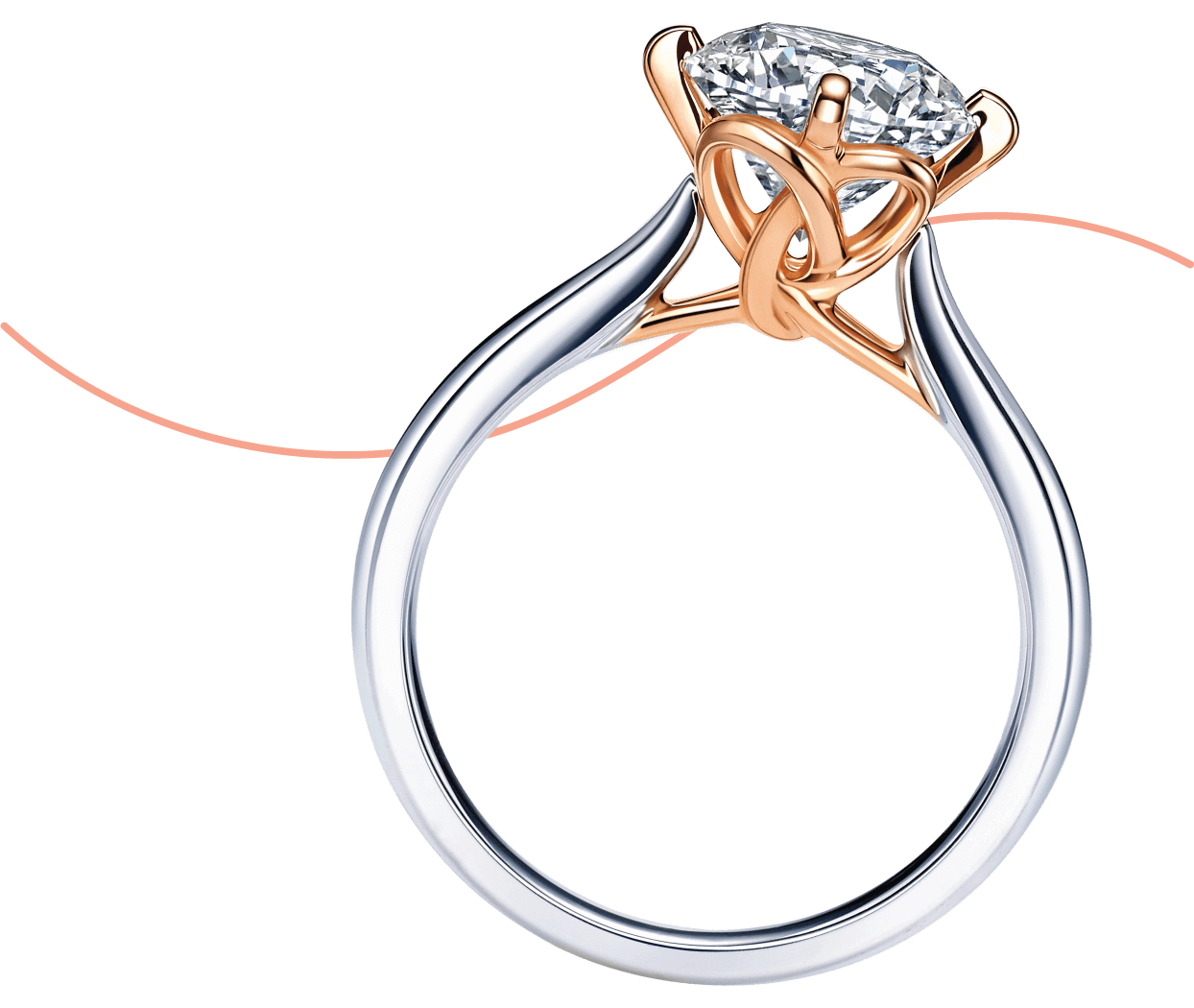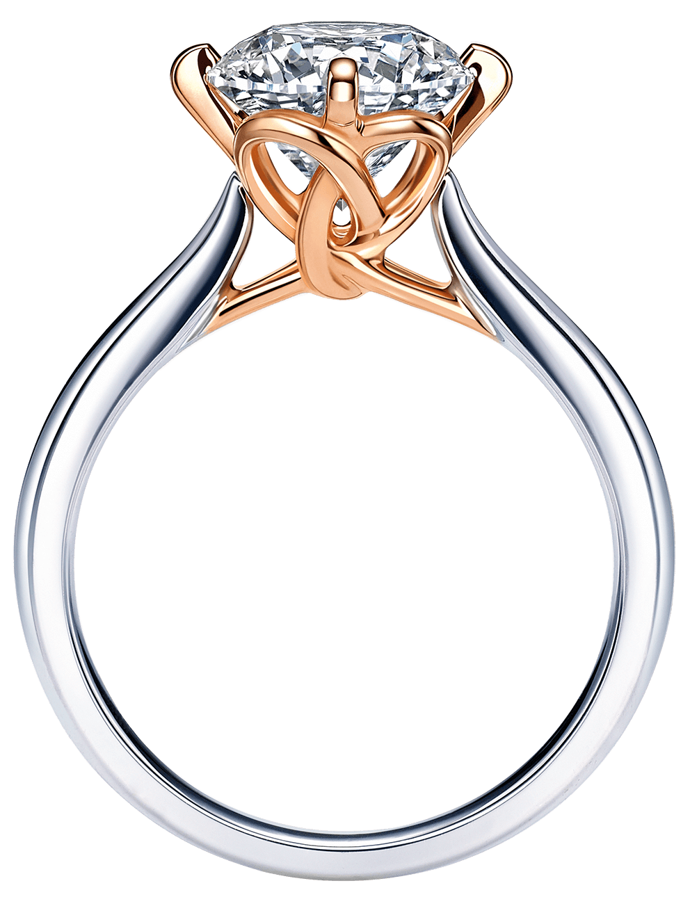 將代表姻緣的紅線化作18K紅金,編織同心繩結, 猶如月老為一對新人牽繫紅線,寓意同心永結。 真分色工藝讓紅金與白金色澤歷久常新,長久永恆。
