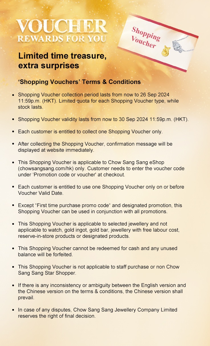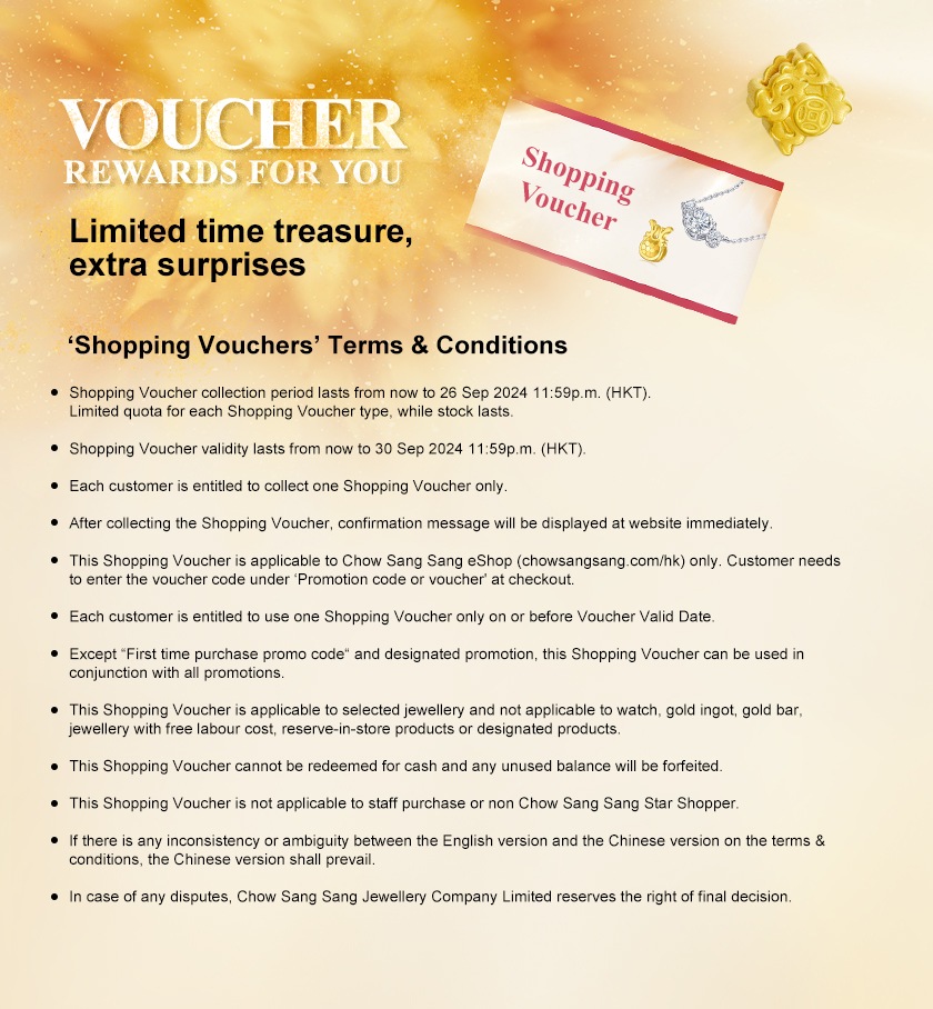 Chow Sang Sang Eshop is launching a voucher-grabbing event, allowing you to purchase a range of gold jewellery such as dragon and phoenix bangles, gold charms, gold necklaces and gold bracelets at even more favourable prices. The collection also includes various 18K white gold, rose gold, and diamond jewellery. Grab your vouchers now.