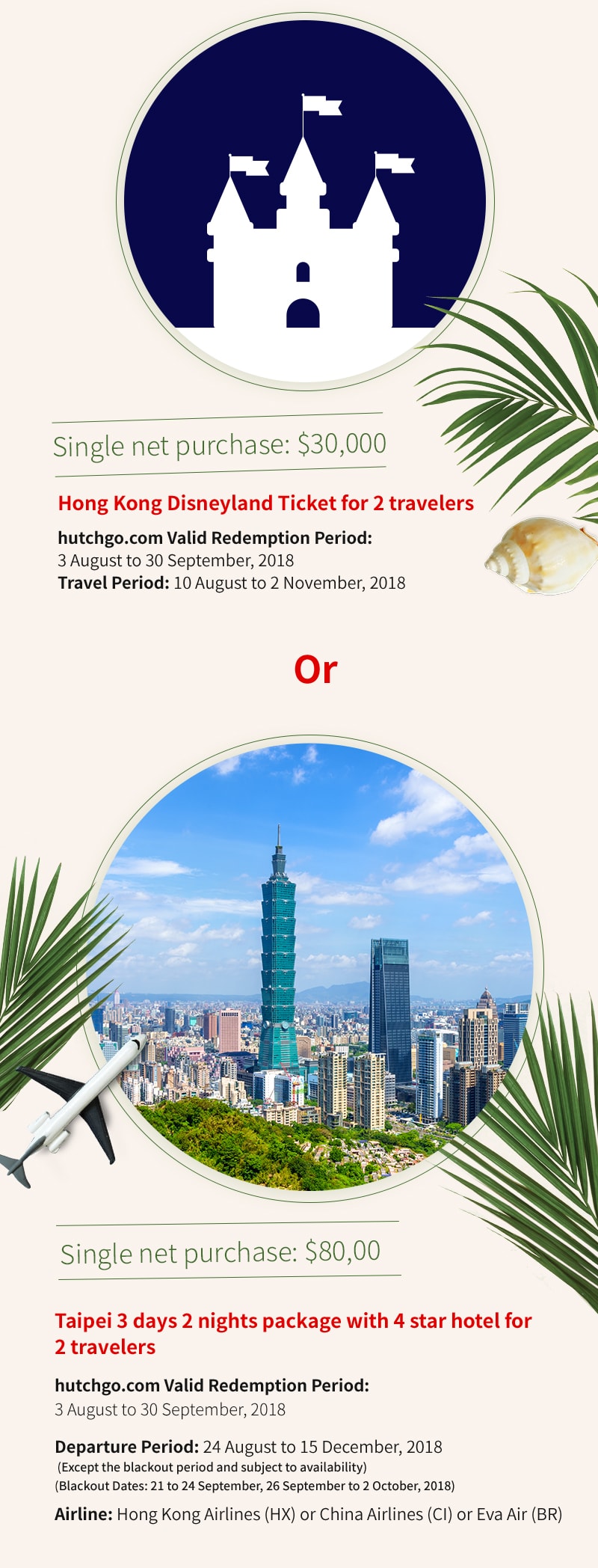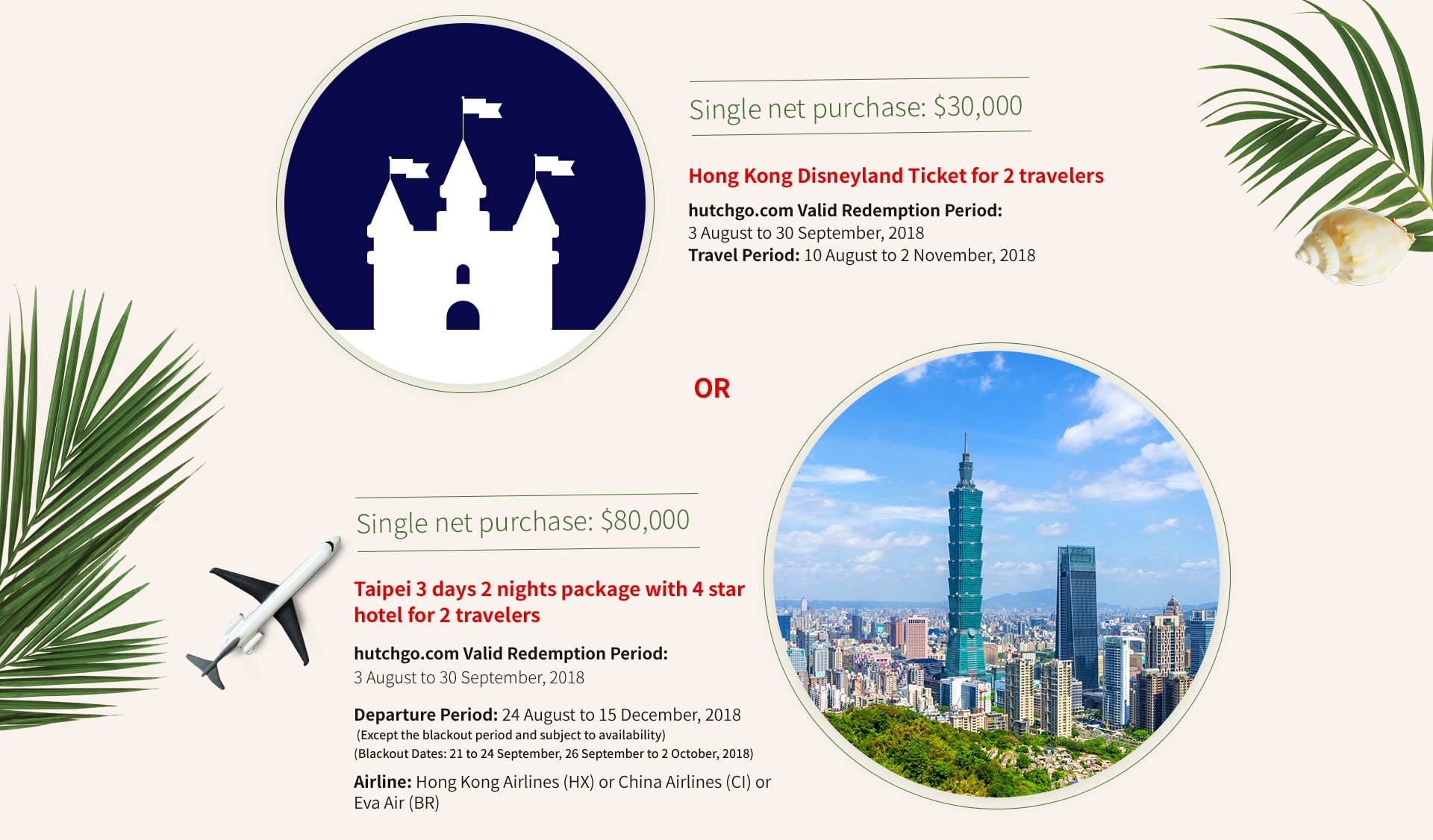 - Customer should book your Taipei 3 days 2 nights package from 3 Aug to 30 Sep 2018 through hutchgo.com designated redemption website. Each redemption code is for one time registration and redemption. Promotion offer is subject to a first-come-first-served basis while stocks last. Once the air ticket is issued, cannot be cancelled nor transferred and travel dates cannot be changed.
