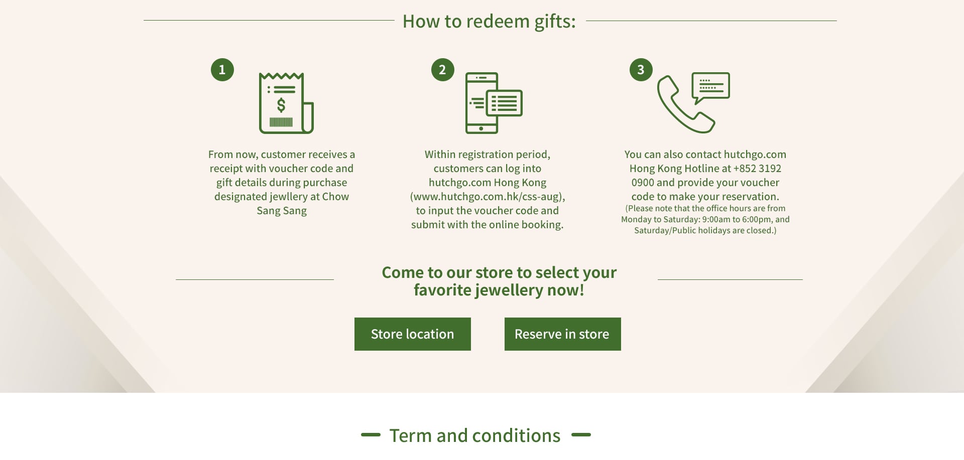 - To book your trip online, please visit www.hutchgo.com.hk/css-aug and hutchgo.com shall contact you within 5-7 working days after receiving the email. huchgo.com HK and Chow Sang Sang Holdings International Limited shall not be liable for any loss or damage caused resulting from incorrect email address or phone number provided by customer, email delivery failure or customer fails to answer the confirmation call from hutchgo.com. If customer does not receive any confirmation call from hutchgo.com within 5-7 working days after the online booking form submission, customer should call hutchgo.com customer service hotline at +852 3192-0900.
