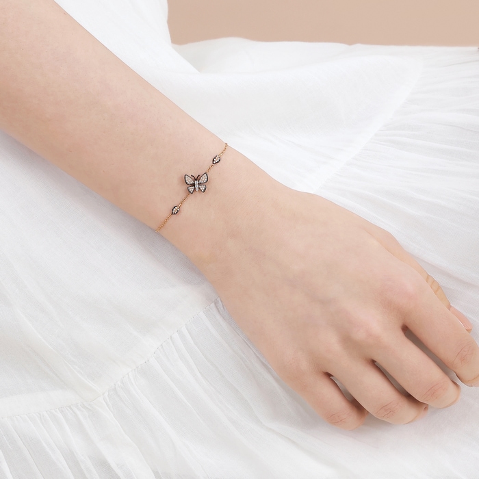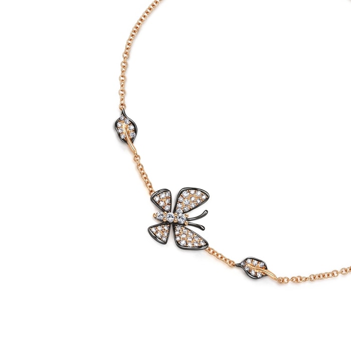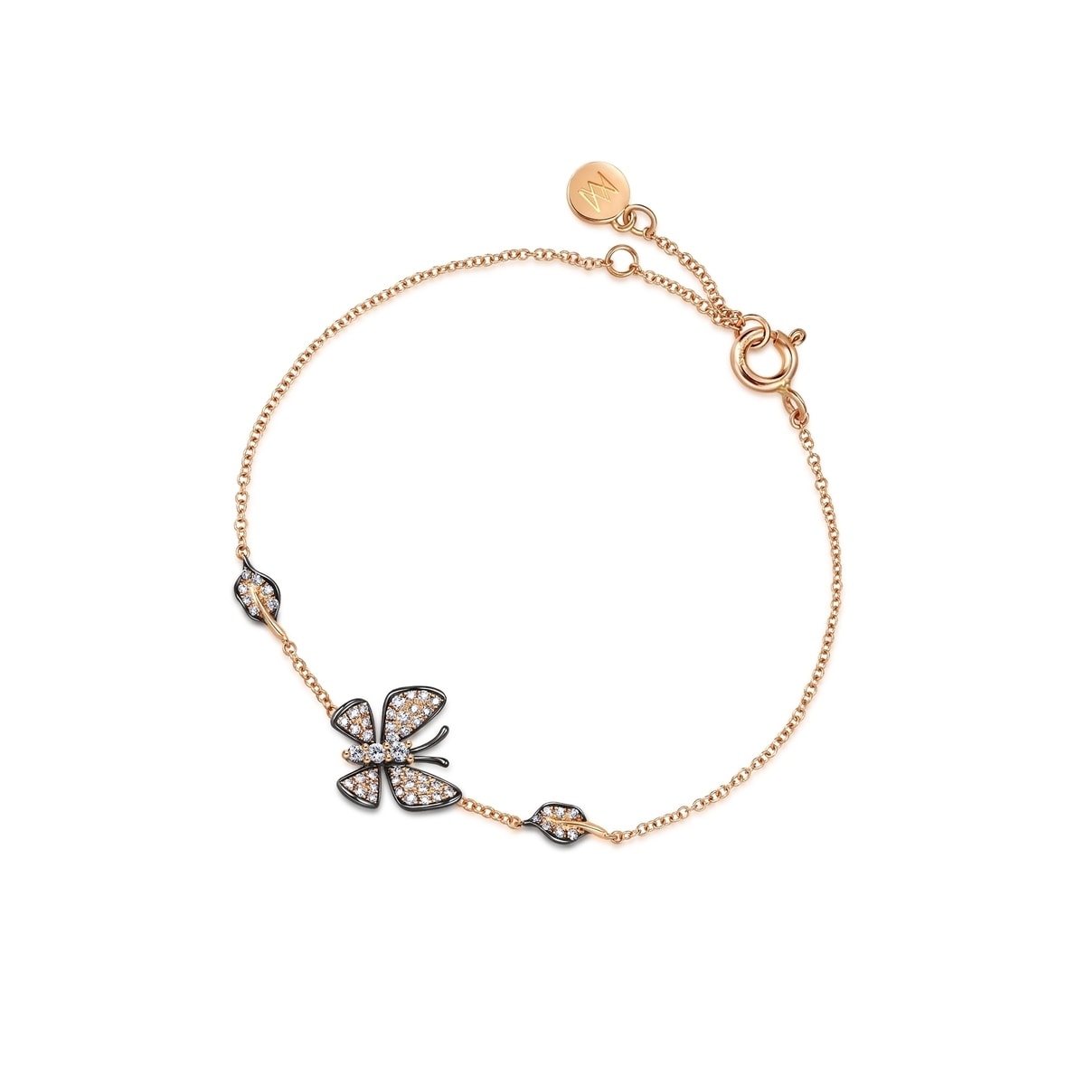 Chow Sang Sang - The diamond-set butterfly flutters its wings on the lively garland of leaves and stems on this bracelet. Black gold accentuates the contours of the butterfly's wings and leaves, bringing the piece to life.