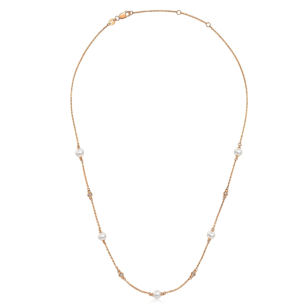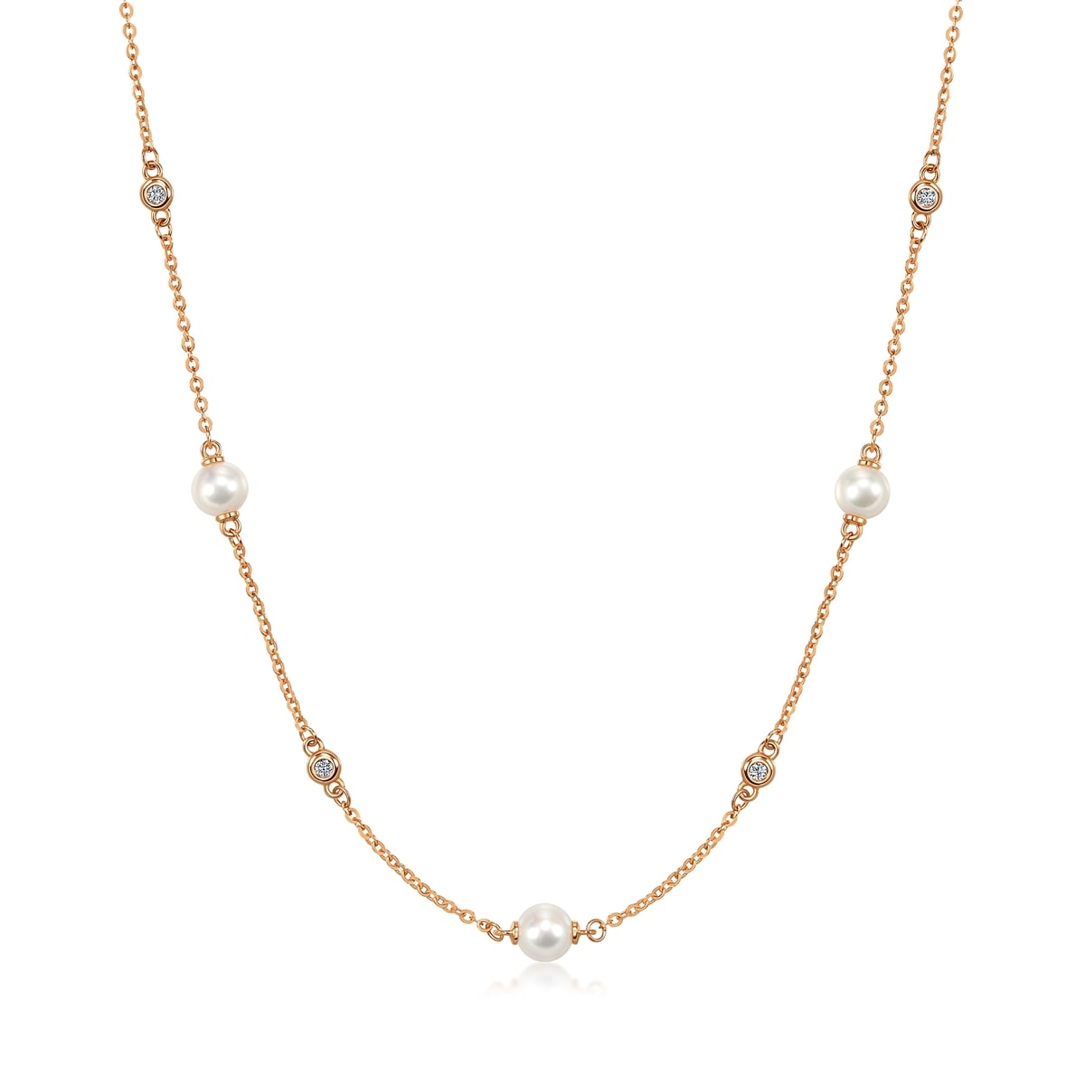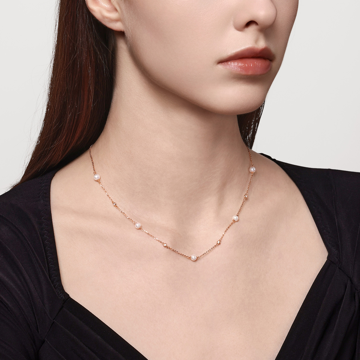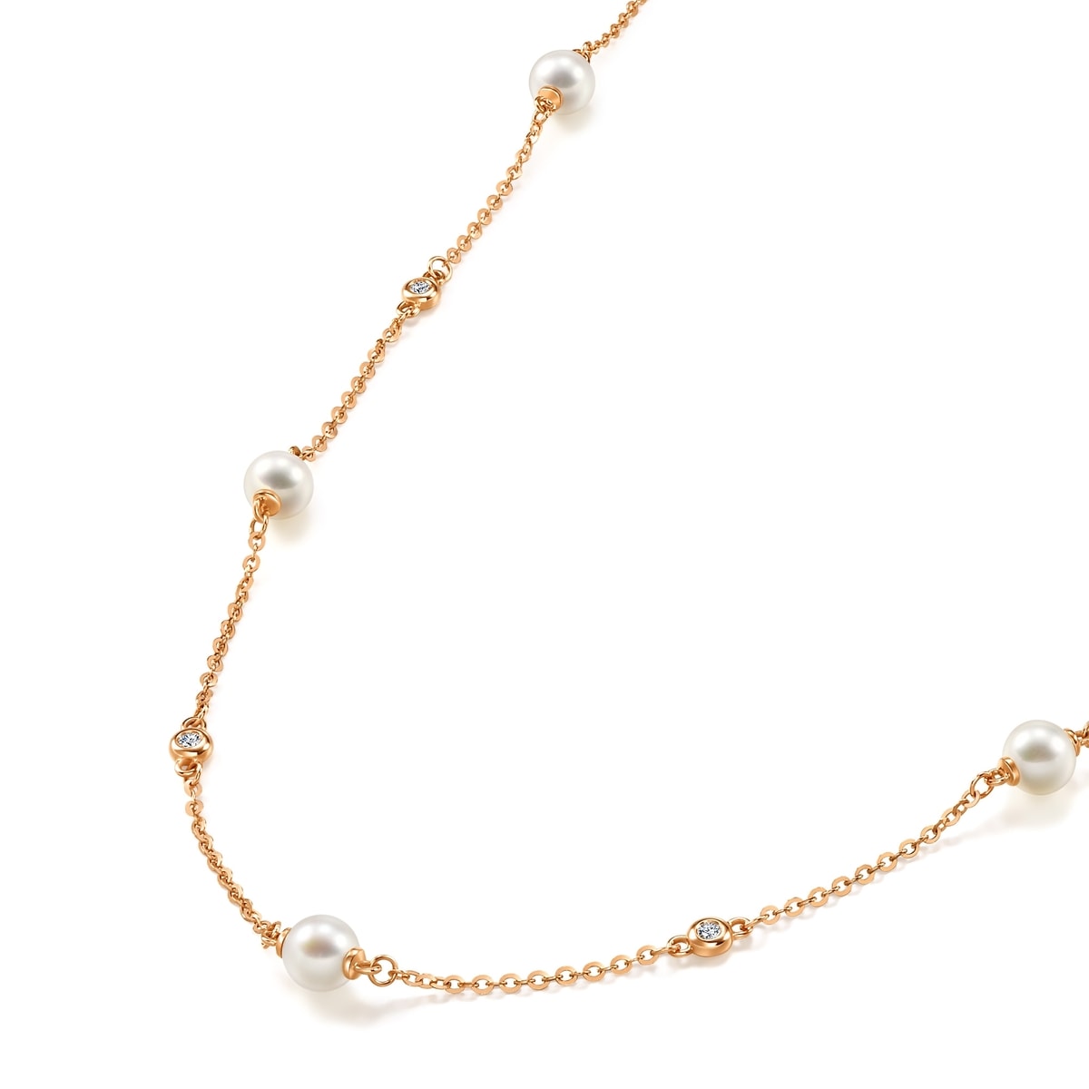 Chow Sang Sang - Crafted in 18K rose gold, this necklace exudes classic minimalist design with alternating pearls and sparkling diamonds, exuding elegant charm.