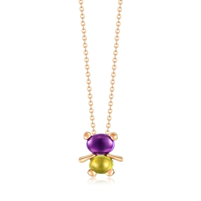 周生生精緻可愛的小熊吊墜造型,配上色彩鮮艷繽紛的彩色寶石。小貓、松鼠、小鹿、小天使等小寵物造型,結合多彩的彩寶石設計,營造喜悅多彩的感覺,為生活增添無限歡欣。