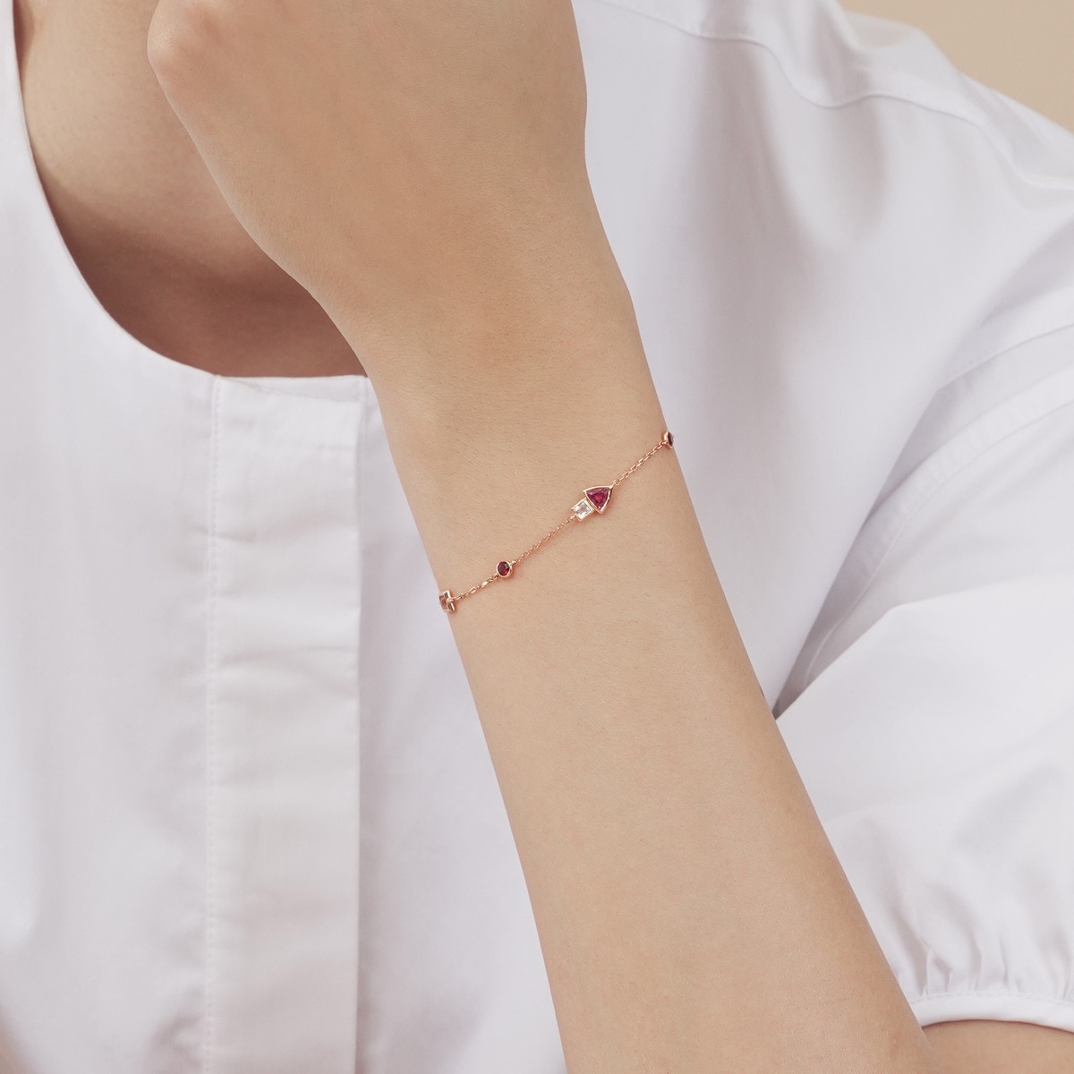 Semi-precious stones add vibrant luminescence to the 18K rose gold pink tourmaline bracelet. Mixing geometric patterns with pink tourmaline and garnet, the design is truly playful and flexible.