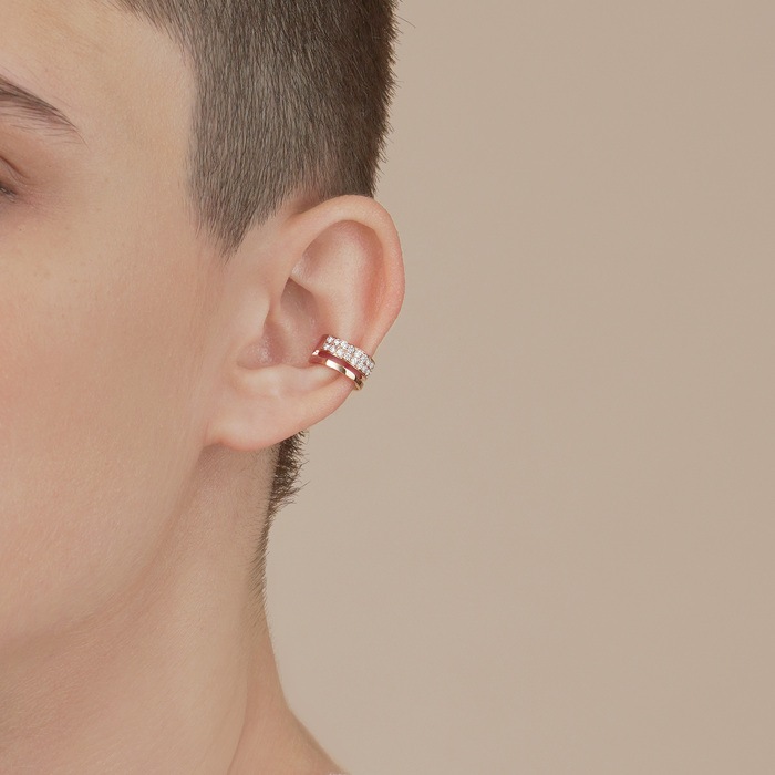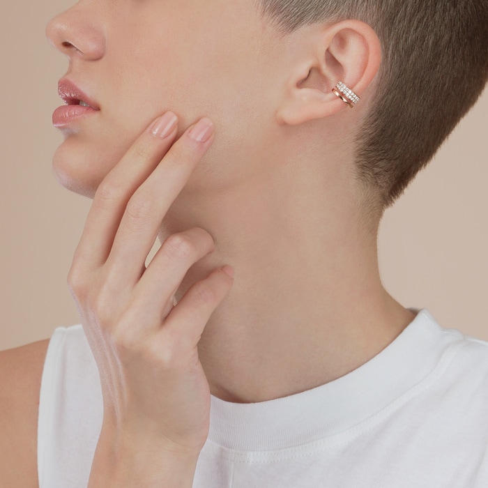 18K玫瑰金鑽石單隻耳夾,低調綴以寓意幸運的六角星設計,令你的耳畔更顯耀眼。能與同系列其他鑽石耳環及耳夾Mix & Match,打造新經典。