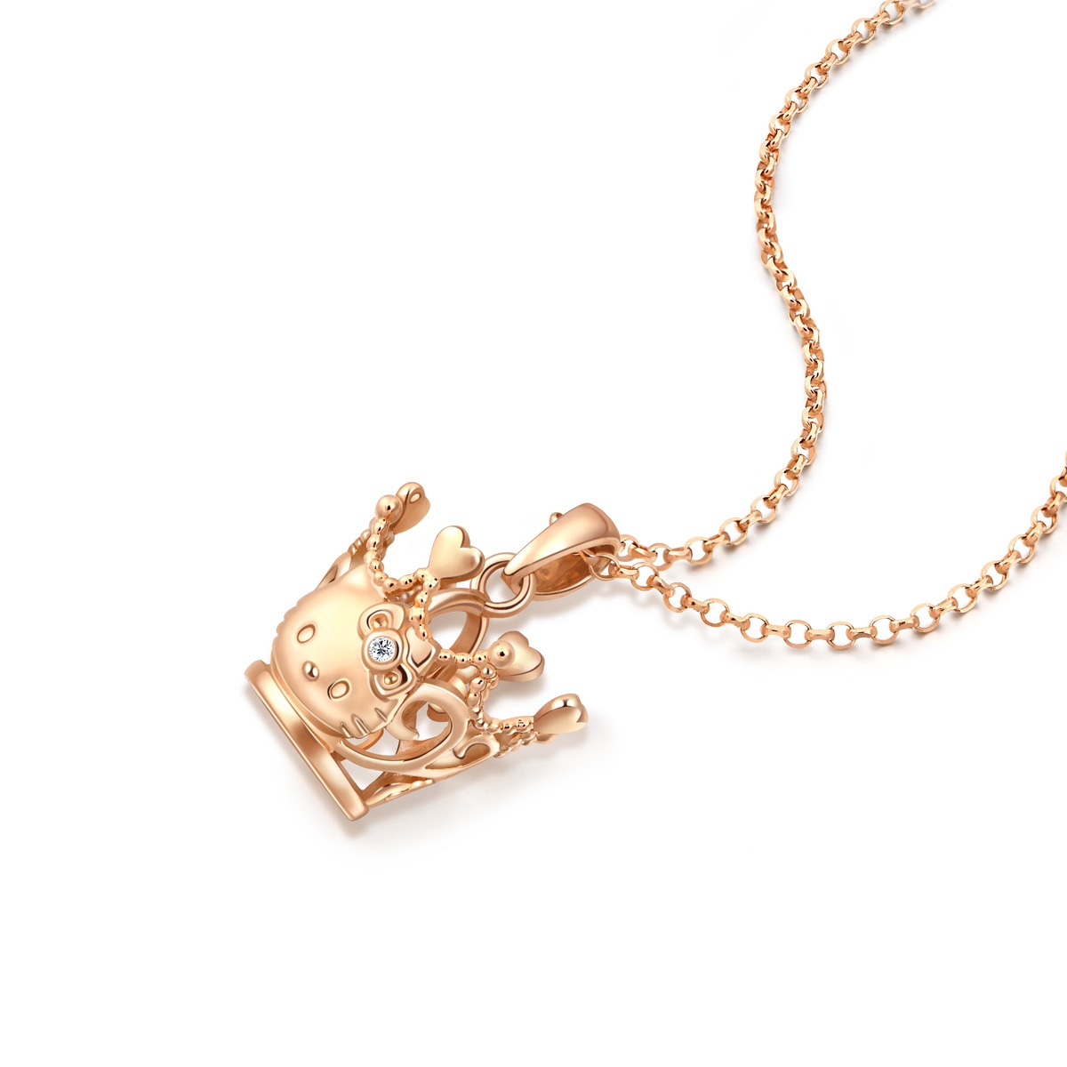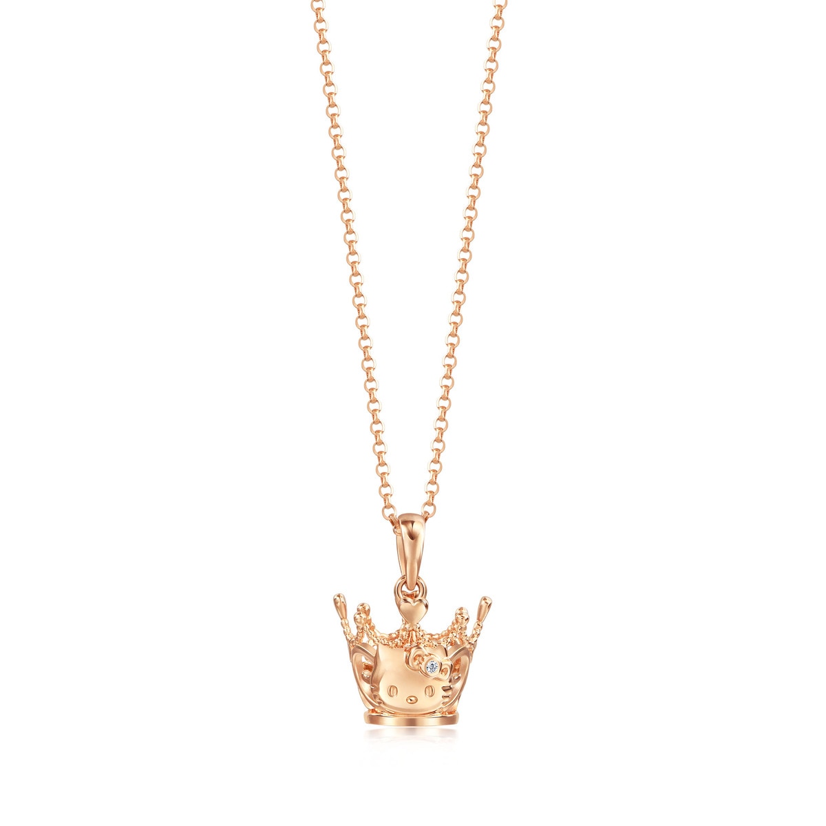 Chow Sang Sang - This 18K red gold Hello Kitty crown necklace features a hollow-carved, vintage crown with beads at the top and a round diamond on the bowtie. Sweet and elegant, it is a tangible representation of princess style.