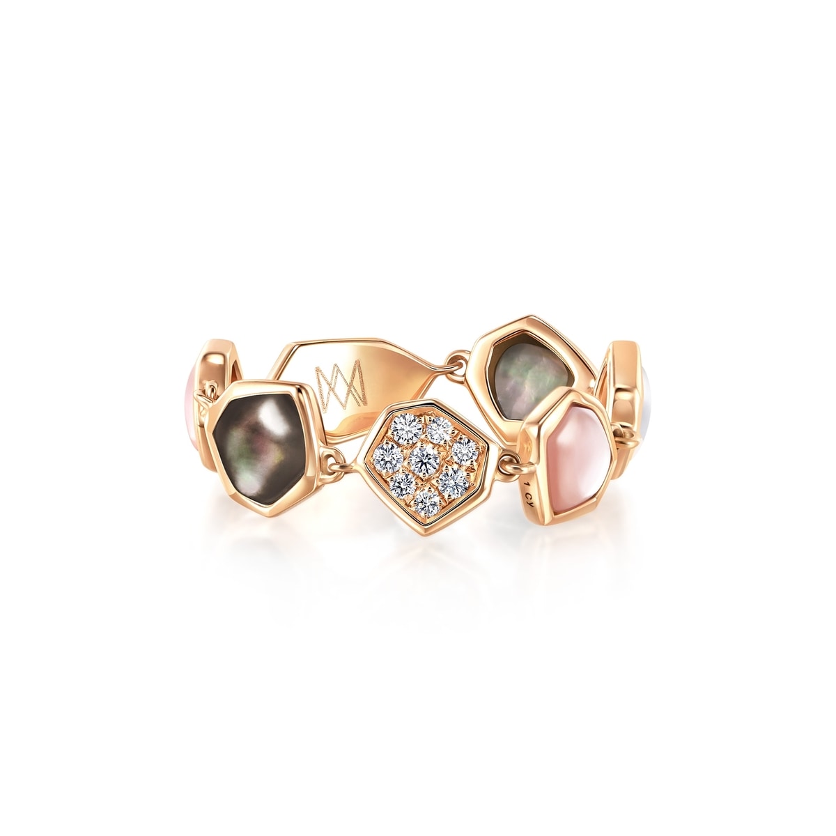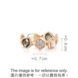 Chow Sang Sang - Irregular diamond-shaped 18K rose gold ring joins various coloured mother of pearls into a loop, foregrounding the purest beauty of this iridescent material. Adorned with dazzling diamonds, it reflects the confident elegance of contemporary ladies. Spin this ring and show different facets of mother of pearls to create versatile style.