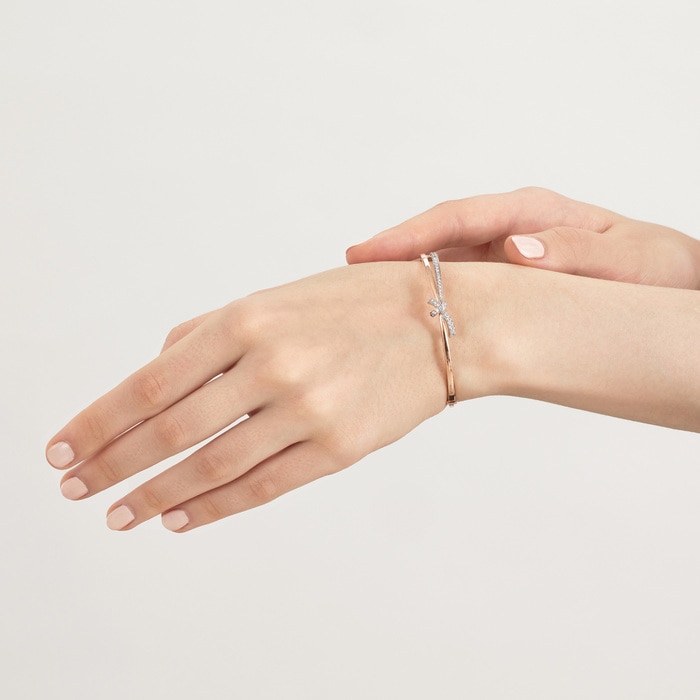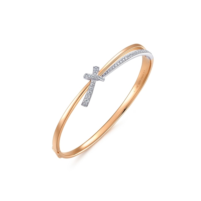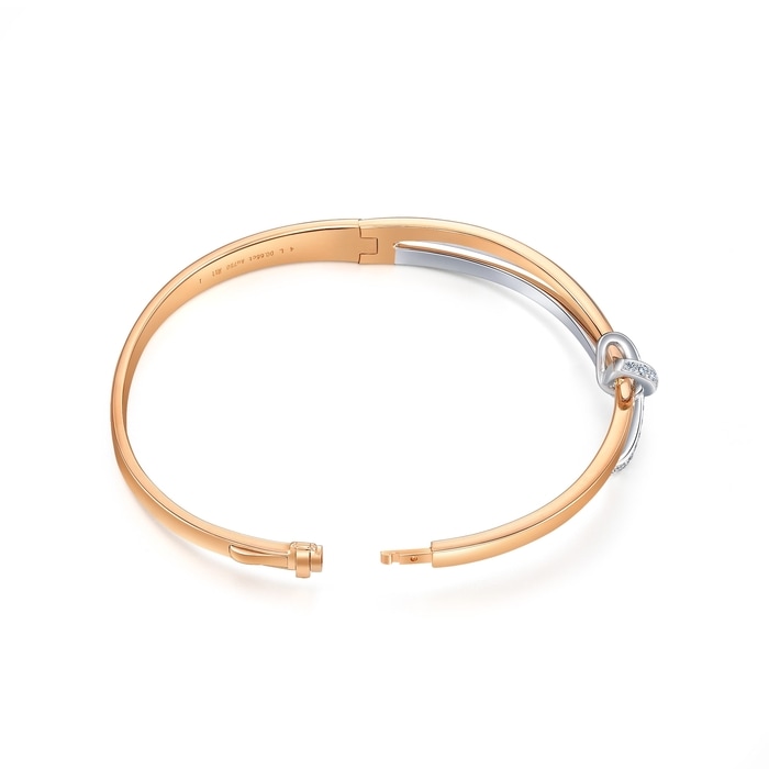 Chow Sang Sang - Fashion and tradition are bound together in this elegant 18K red and white gold diamond bangle that symbolizes tying the knot. Pavé diamonds lie at the entwined ends of the Real Multi-tone gold as a visible representation of eternal connection between lovers.