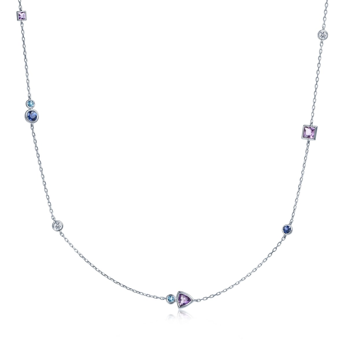 Semi-precious stones add vibrant luminescence to the 18K white gold amethyst diamond necklace. Mixing triangular, circular and square geometric patterns with sapphire, diamond, blue topaz and amethyst, the designs are playful and exuberantly flexible.