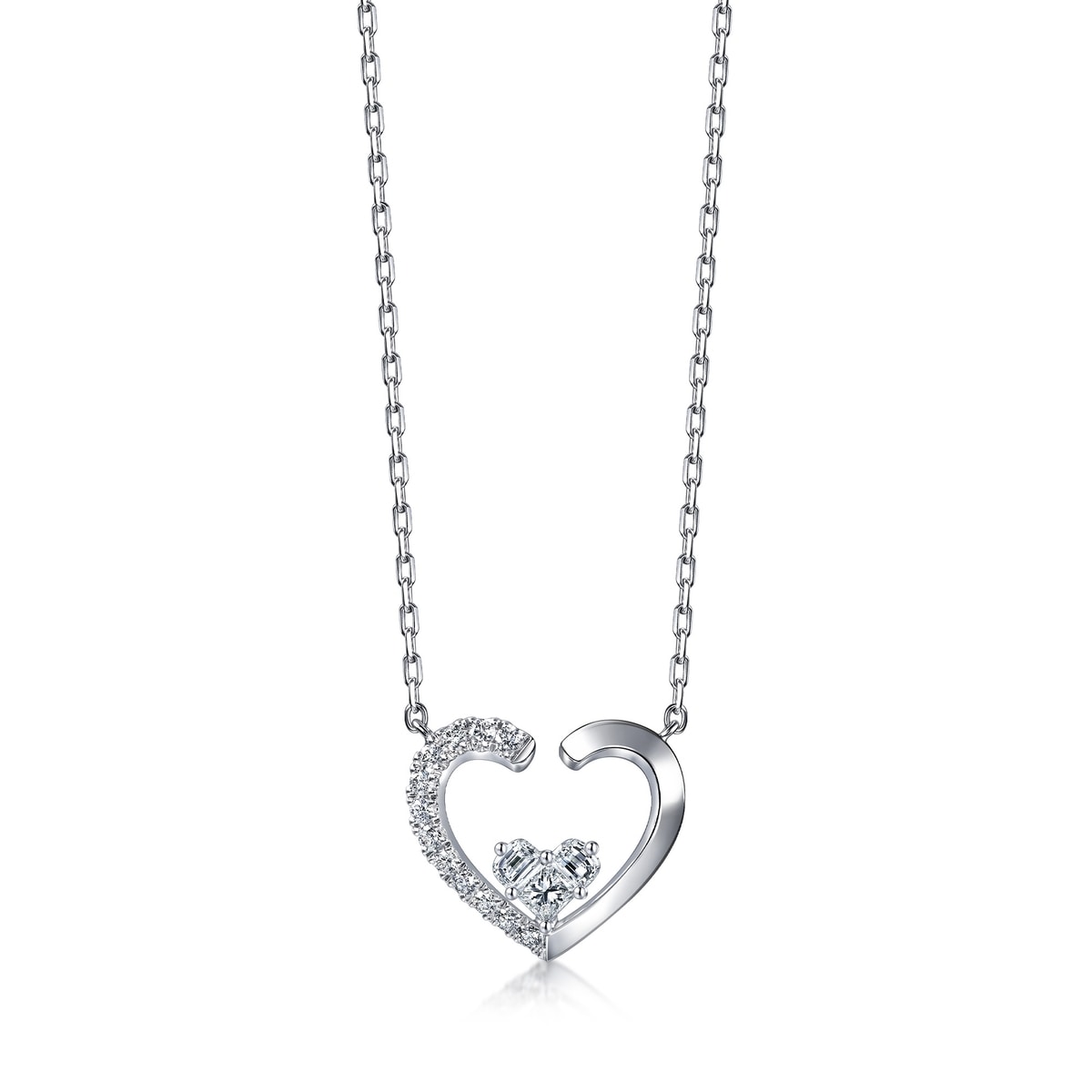 This 18K white gold diamond necklace features the Lady Heart design where three meticulously cut diamonds form a heart, crafted with two half-moon diamonds and one princess-cut diamond, complemented by a heart-shaped frame set with scattered diamonds, symbolising romantic love.