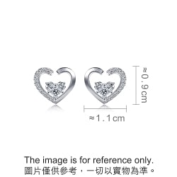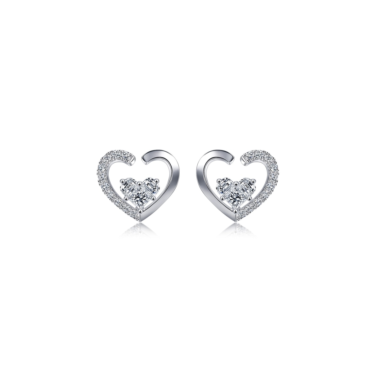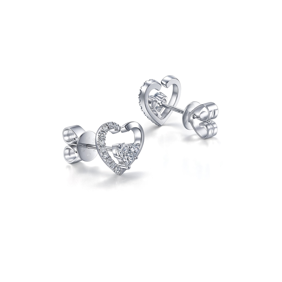 These 18K white gold diamond earrings feature the Lady Heart design where three meticulously cut diamonds form a heart, crafted with two half-moon diamonds and one princess-cut diamond, complemented by a heart-shaped frame set with scattered diamonds, symbolising romantic love.