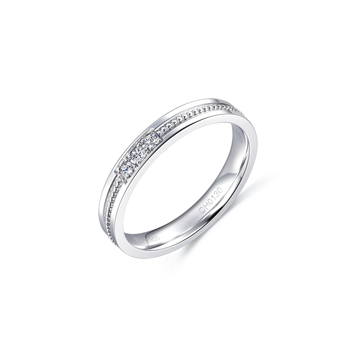 周生生戒指屬於「小皇冠」系列,以950 鉑金打造時尚簡潔的設計,中間鑲上三顆小圓鑽,閃爍動人,搭配戒環上的小圓珠,猶如冠冕一般,展現可愛公主風。