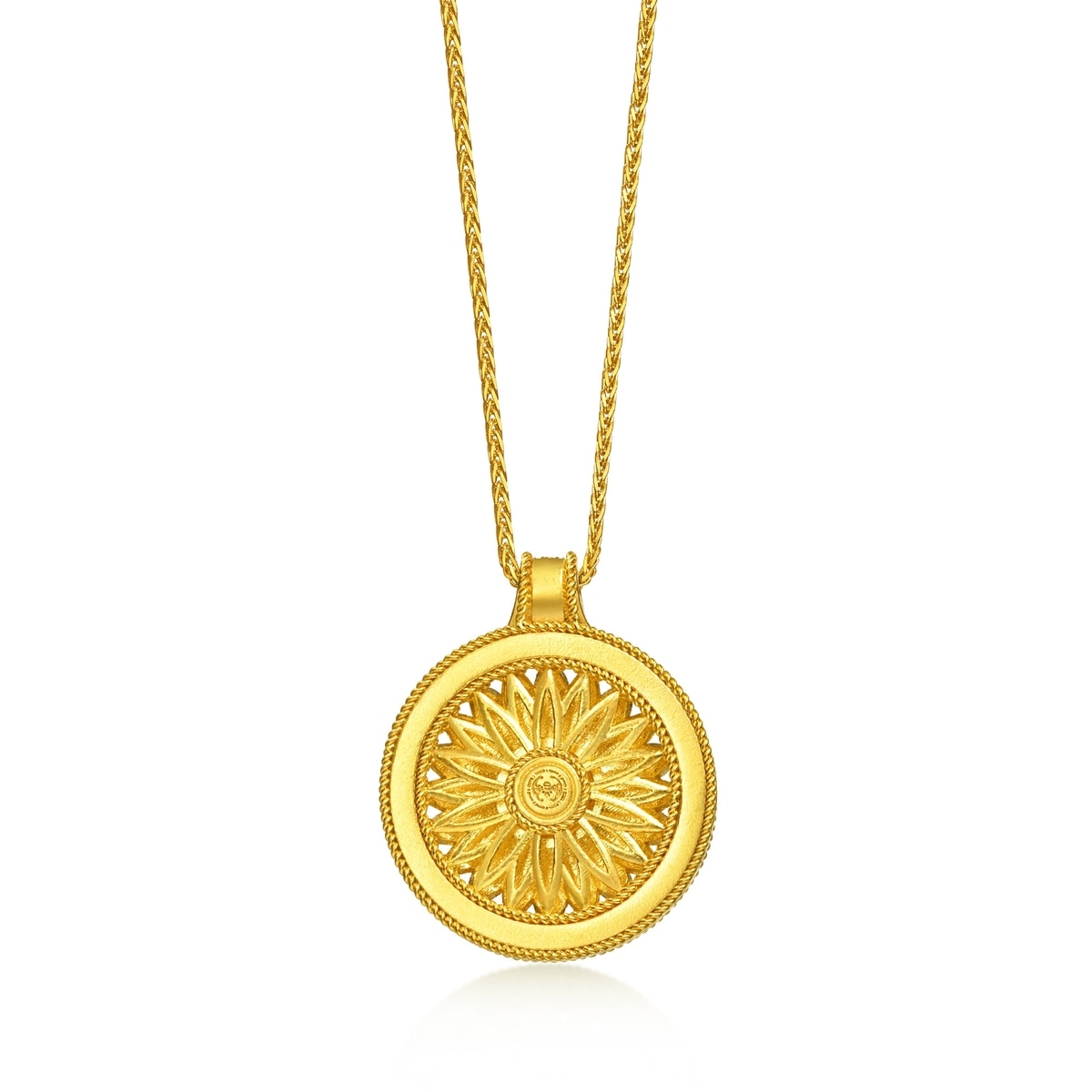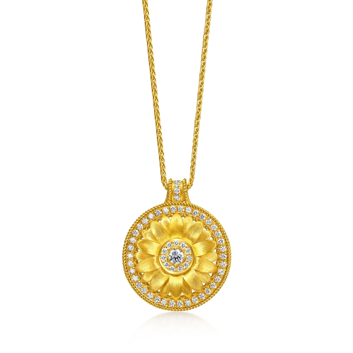 Chow Sang Sang - The symmetrical lotus motif is inspired by the Buddhist 'Mandala' symbol, symbolizes prosperity and bestows blessings. Crafted with traditional goldsmith techniques and a delicate brushed finish, this gold diamond necklace feature dazzling diamonds set in gold, radiating in captivating layers and exuding Eastern elegance.
