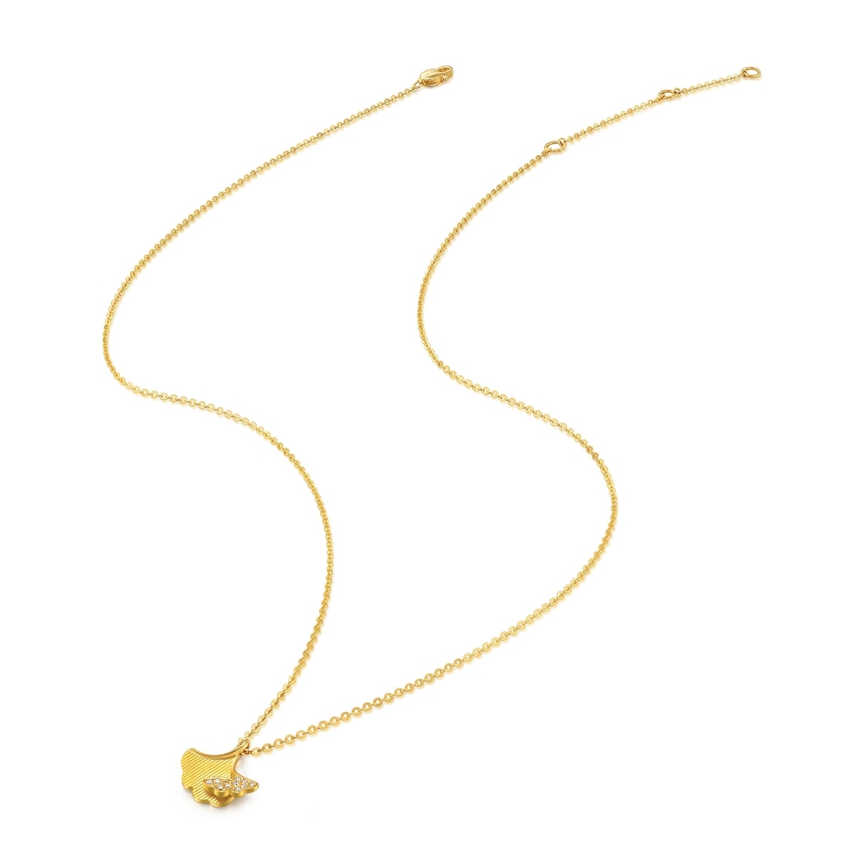Chow Sang Sang -This gold and diamond necklace is inspired by the "Ginkgo leaf." It is crafted using hard solid gold technique and meticulously set with diamonds to create clean and sleek lines, injecting a fashionable and elegant style into everyday outfits.
