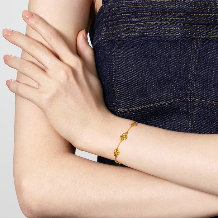 Chow Sang Sang Glow collection triangular windmill gold bracelet, crafted using 5D hard gold technique, highly polished to show quality, high hardness and lightweight gold, with a three-dimensional and layered design. Inspired by geometric elements, the lines are smooth, the surface shines like a mirror, symbolising free flow like water, living freely, sparkling like gold, confident and beautiful. The design is simple and elegant, suitable for wearing on various daily occasions.