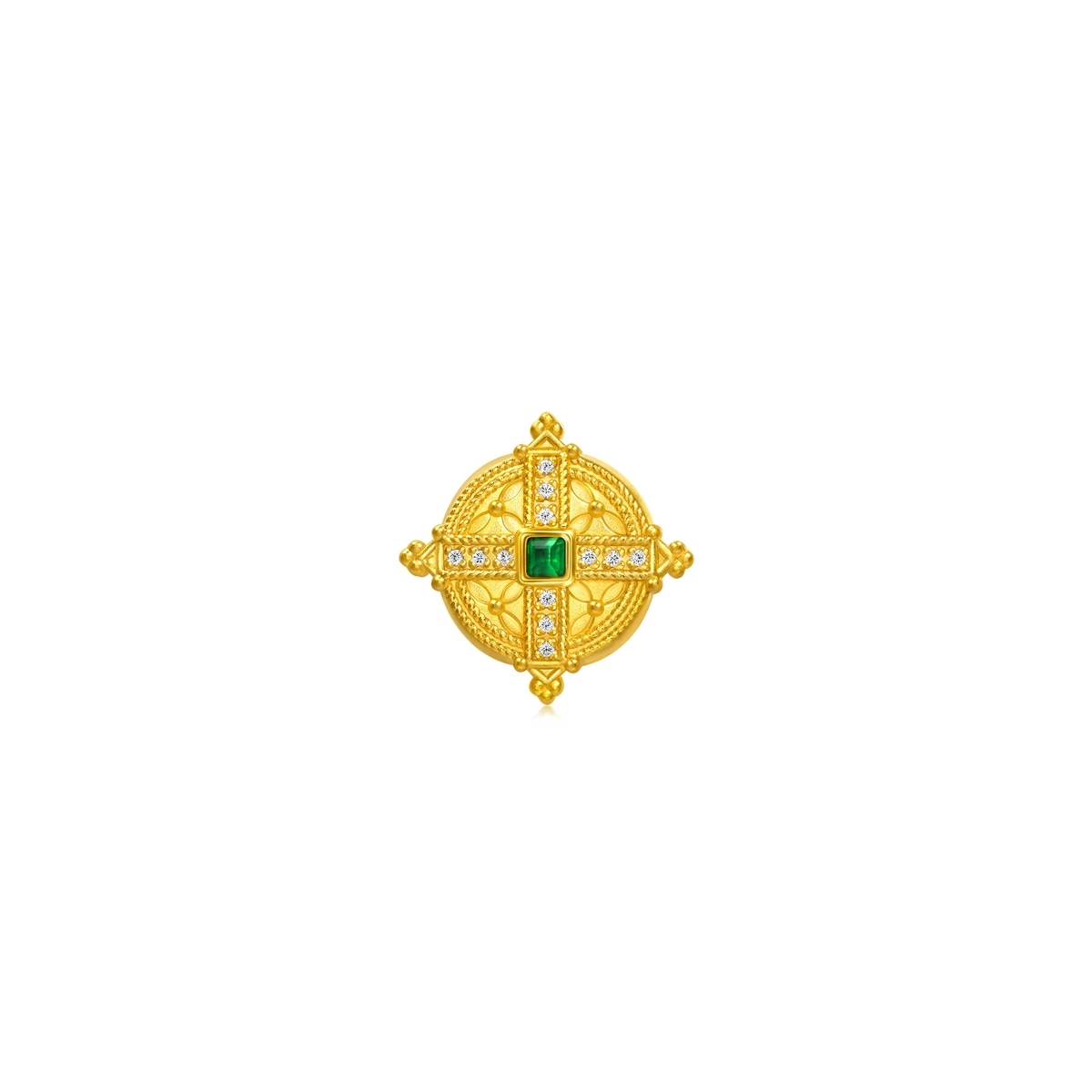 Chow Sang Sang - Inspired by the V&A artifacts crafted by renowned London goldsmith John Brogdens, this gold diamond charm revives intricate cross motifs through the electroforming technique, enhanced with micro diamond setting and colour coating at its heart, blending vintage elegance with opulent allure.