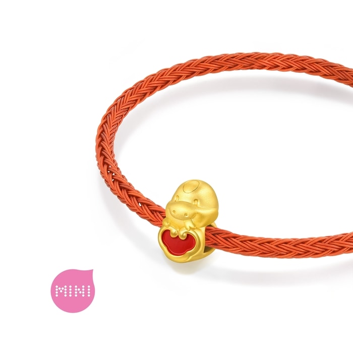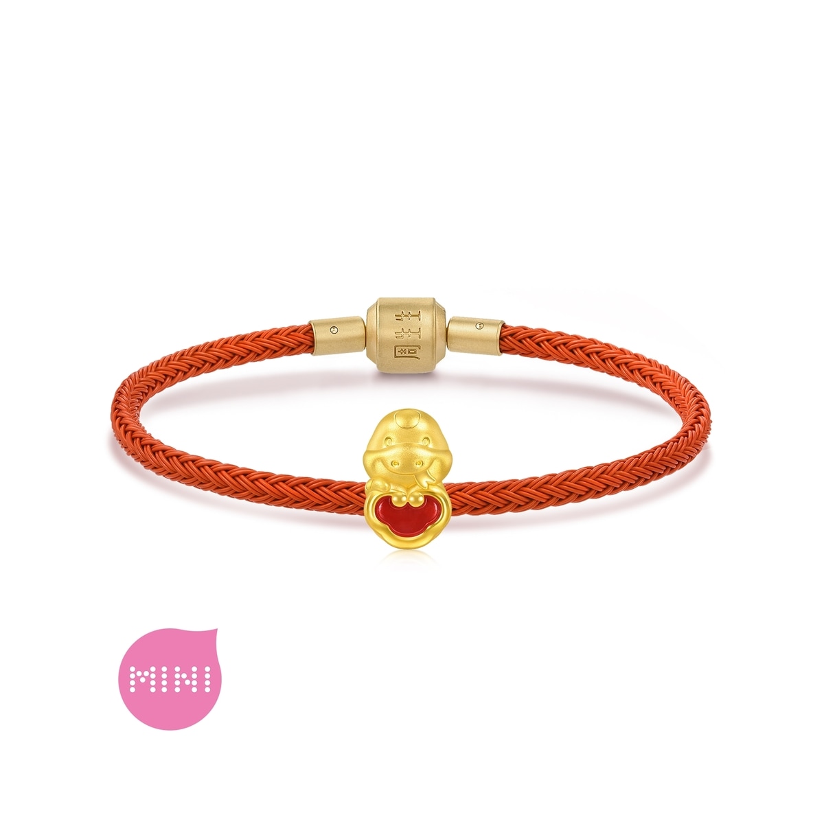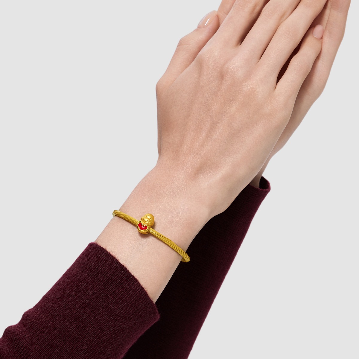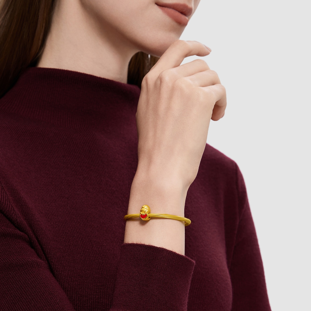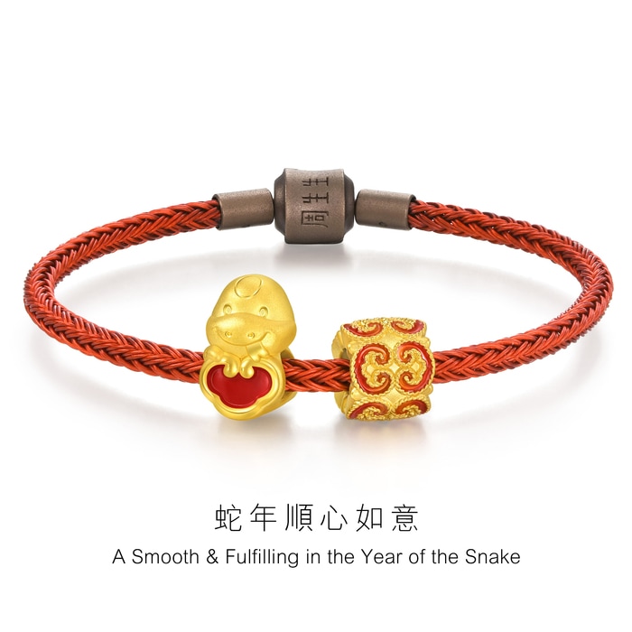 周生生足金串珠結合「如意」與「金蛇」兩大設計元素,採用卓越硬黃金電鑄工藝,細緻刻劃小蛇的乖萌表情,特別注入紅色彩繪塗層,突出如意造型,象徵事事如意、平安吉祥。