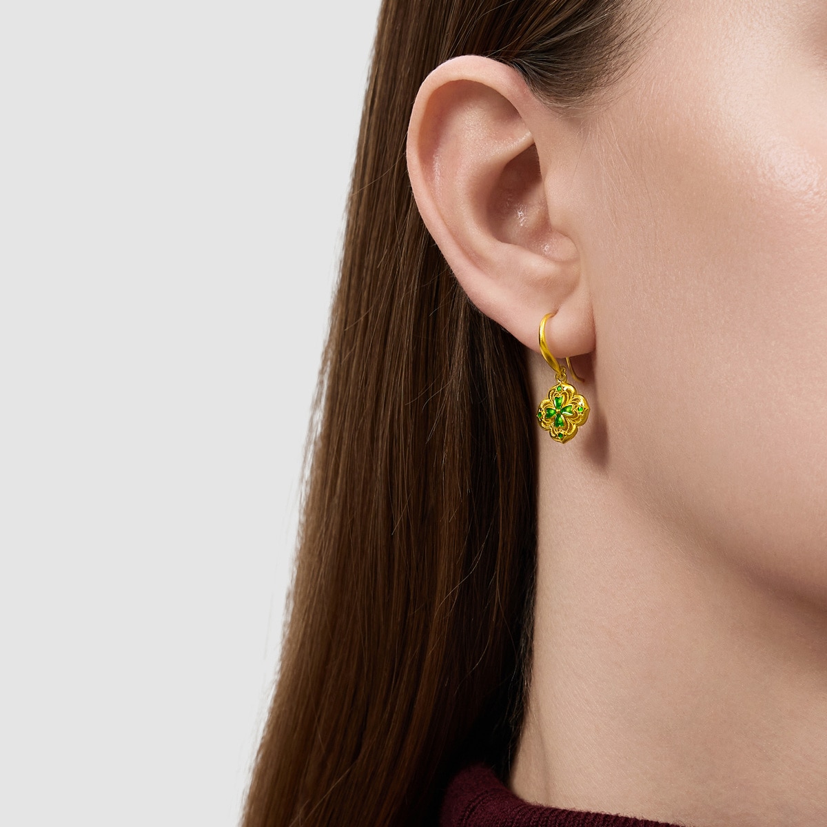 The Chow Sang Sang Taffy collection 24K Gold Earrings are inspired by the four-leaf clover and begonia patterns. Featuring a double-sided design, the floral motif on the back echoes the front, with the outer contour adorned with begonia patterns. Transitioning in the middle is the delicate brushed finishing technique forming a four-leaf clover shape, while the central part is embellished with a green painted enamel coating. The four-leaf clover symbolises happiness and luck, embodying vibrancy, good fortune, and long-lasting prosperity in all endeavors.