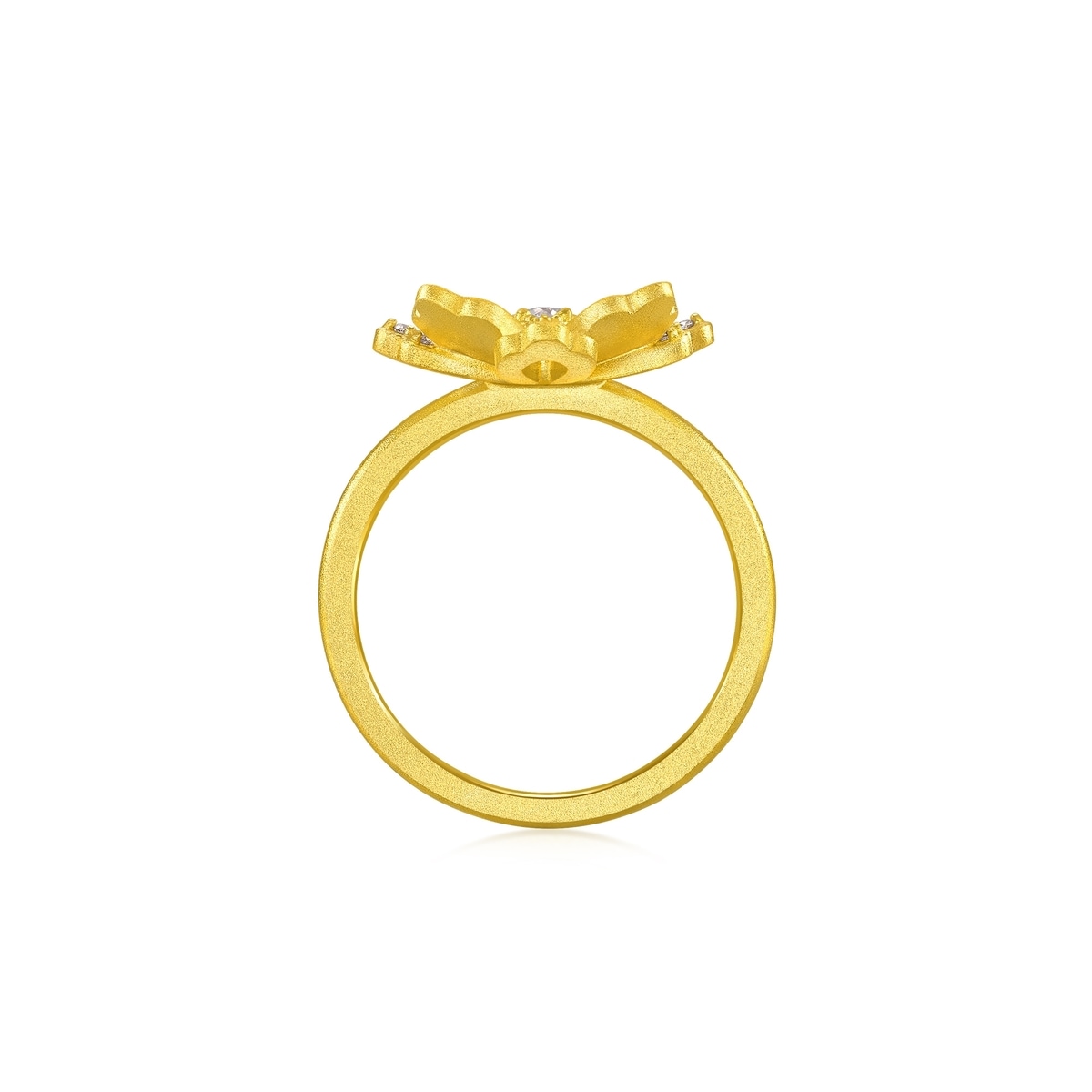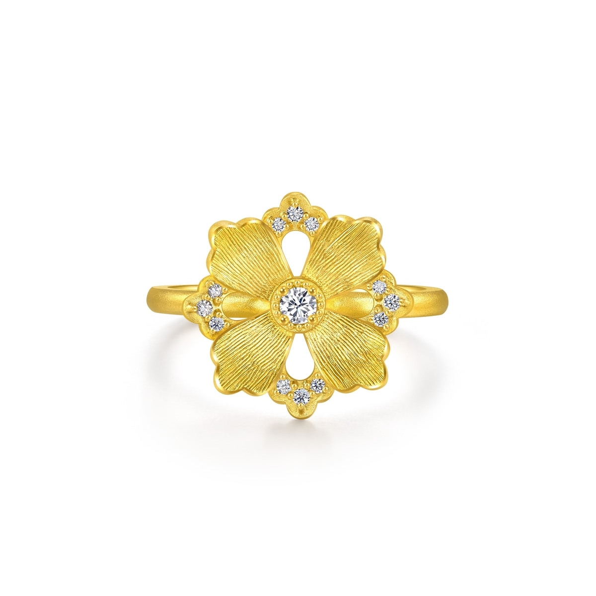 Chow Sang Sang - This gold ring is inspired by 'Blossom', crafted using hard solid gold technique to create its three-dimensional form. Adorned with diamonds as the flower's pistils, the petals are treated with a brushed texture to depict intricate details. The Blossom symbolises hope, auspiciousness, and happiness.