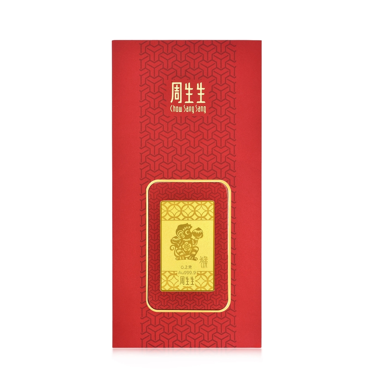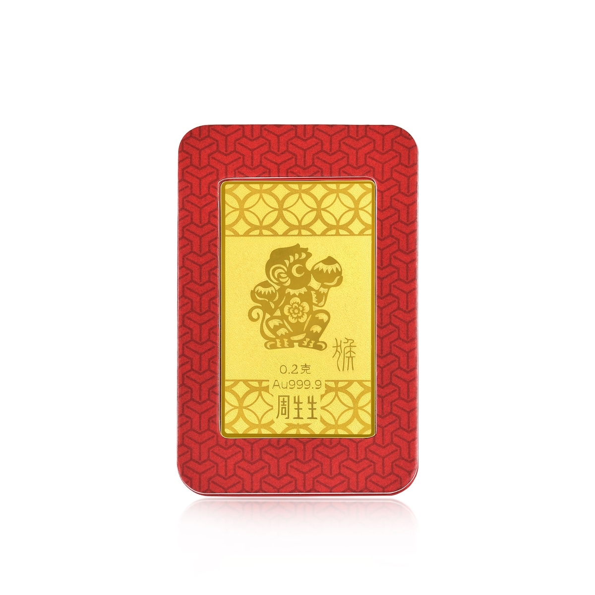 周生生足金金片以「猴」為造型,採用啤壓技術,傾注匠心工藝,營造別具古典質感的剪紙效果,讓金猴造型活靈活現。藉傳統典故申「猴」、子「鼠」、辰「龍」三合的美好寓意,象徵為屬鼠、屬龍者帶來幸運與守護,祝福新一年平安順願。