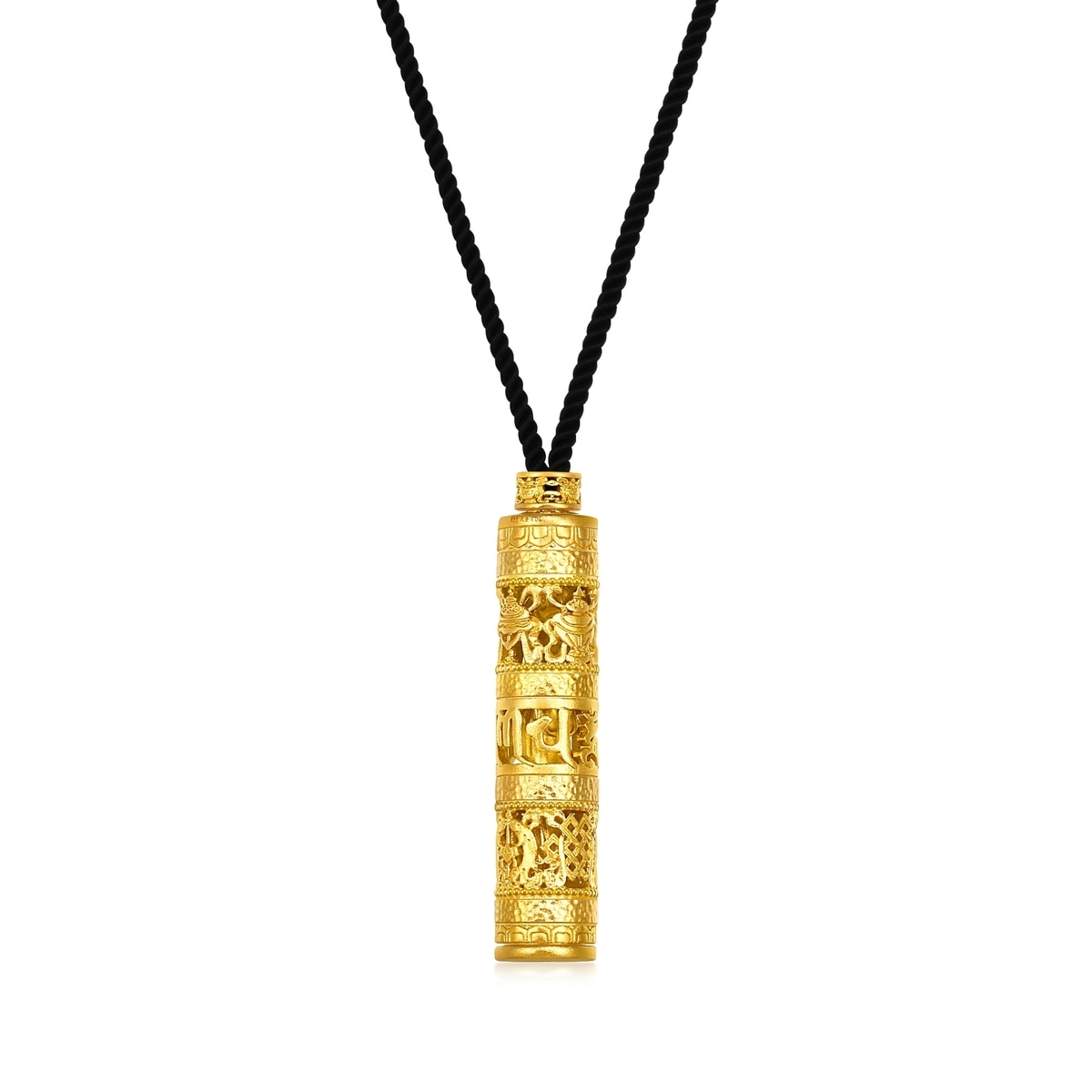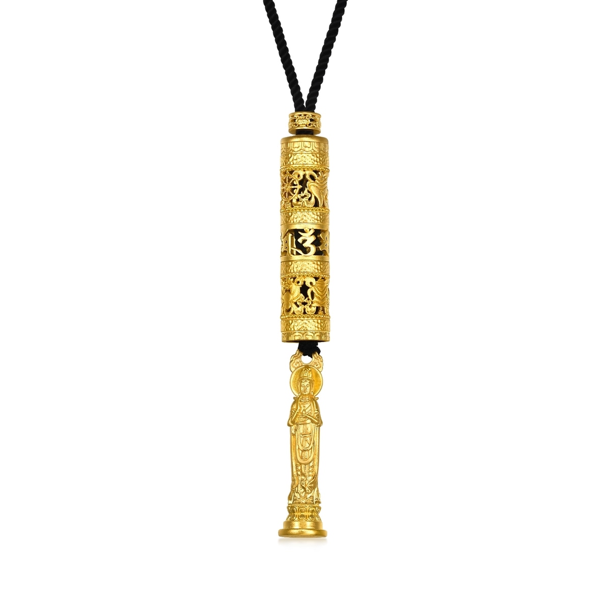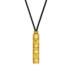Chow Sang Sang - This gold necklace incorporates traditional goldsmith techniques to create a unique hollow design and delicately presents the compassionate face of Guanyin, symbolising good fortune, peace, and the fulfillment of wishes. The pendant features an outer layer in the form of a prayer wheel adorned with Buddhist totems, with the surface embellished with intricate Buddhist symbols.