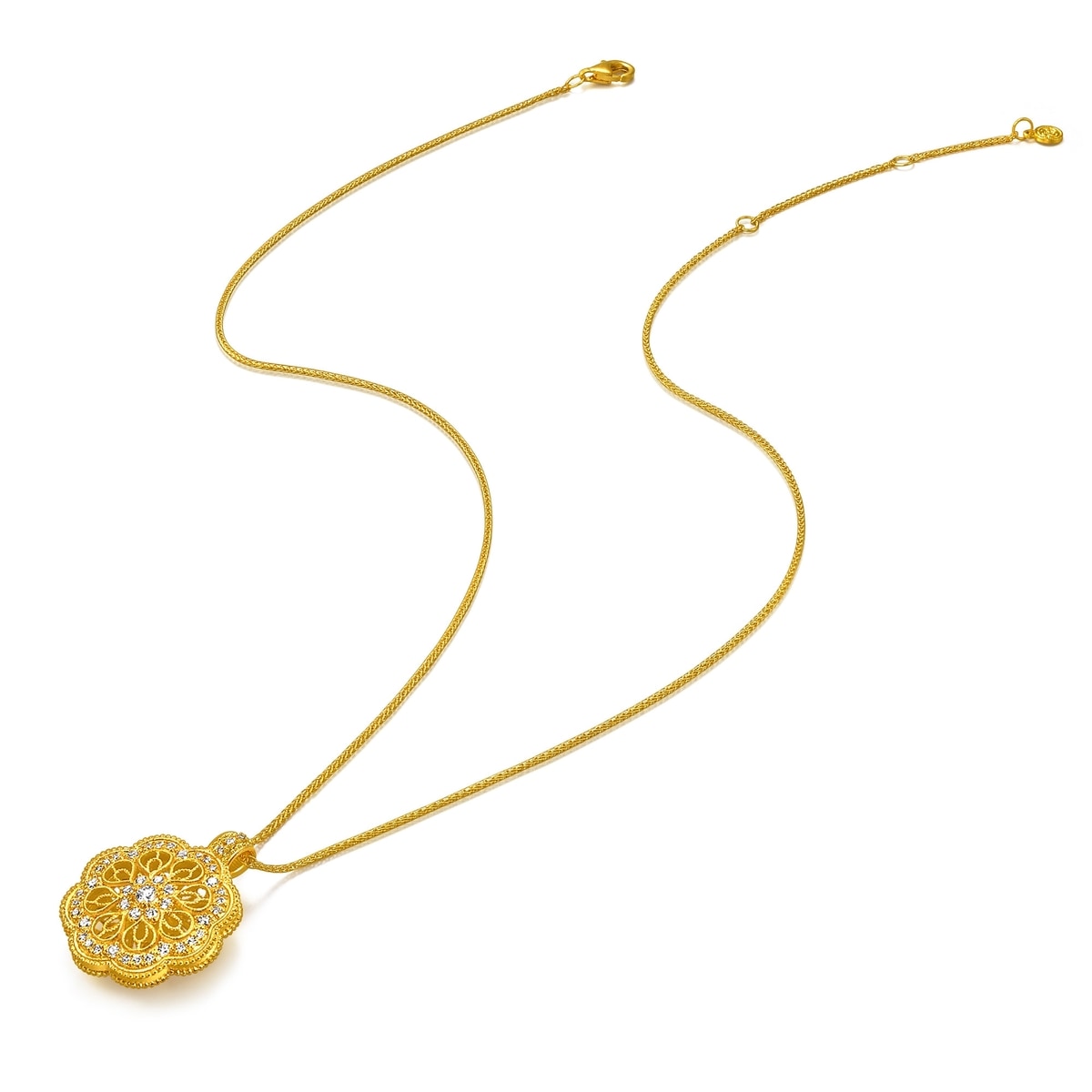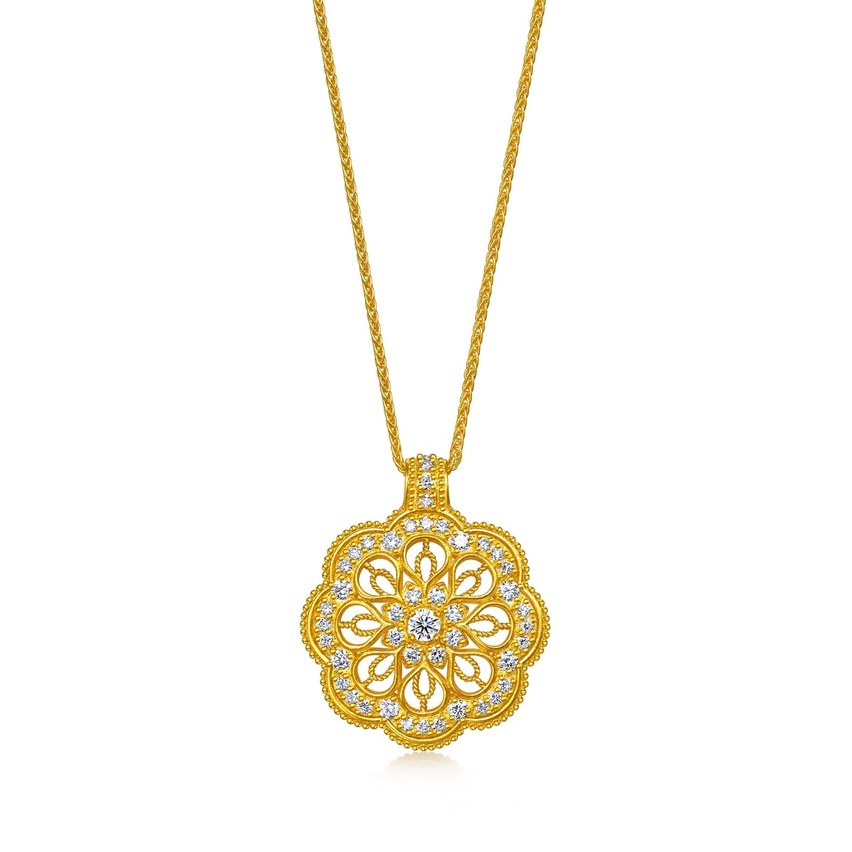 Chow Sang Sang - This gold diamond necklace is inspired by the Buddhist 'Mandala' symbol, crafted using traditional goldsmith techniques and filigreeing to present its hollow design, symbolising peace, protection, and blessings for body and mind.