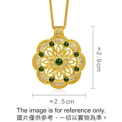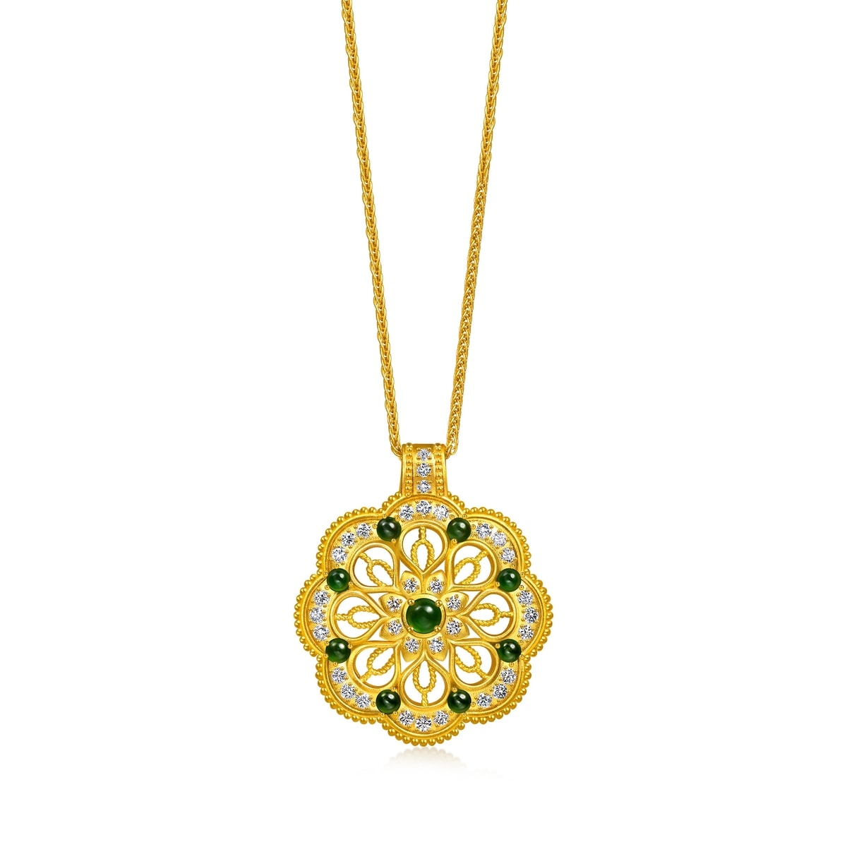 Chow Sang Sang - This gold diamond necklace is inspired by the Buddhist 'Mandala' symbol, crafted using traditional goldsmith techniques and filigreeing to present its hollow design, symbolising peace, protection, and blessings for body and mind. Accented with jade, it amplifies eternal prosperity, serenity and vitality.