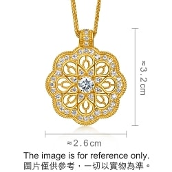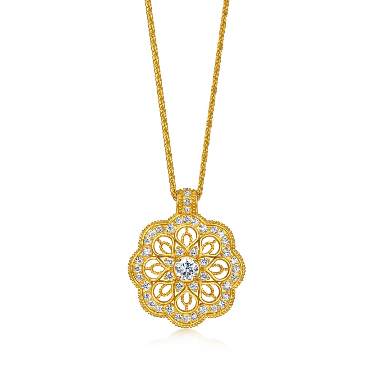Chow Sang Sang -This gold diamond necklace is inspired by the Buddhist 'Mandala' symbol, crafted using traditional goldsmith techniques and filigreeing to present its hollow design, accentuated by a central solitaire diamond, symbolising peace, protection, and blessings for body and mind.