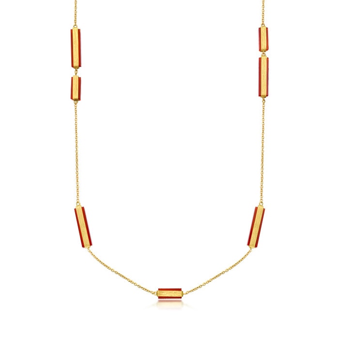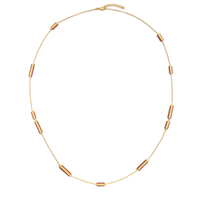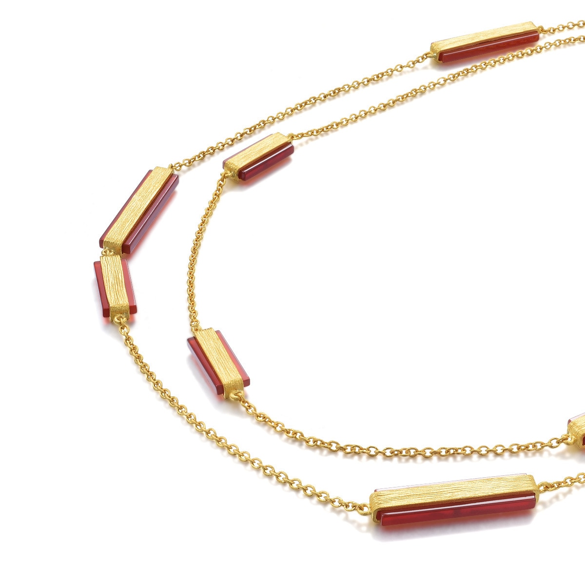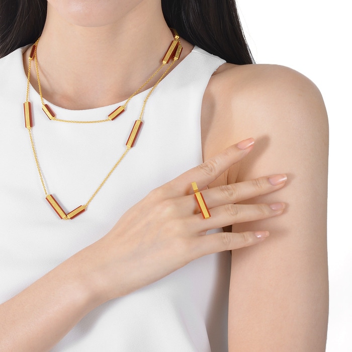 頸鍊中的紅瑪瑙以不規則排序,配合黃金拉絲工藝,設計充滿現代感,充份展現女士低調奢華的一面。