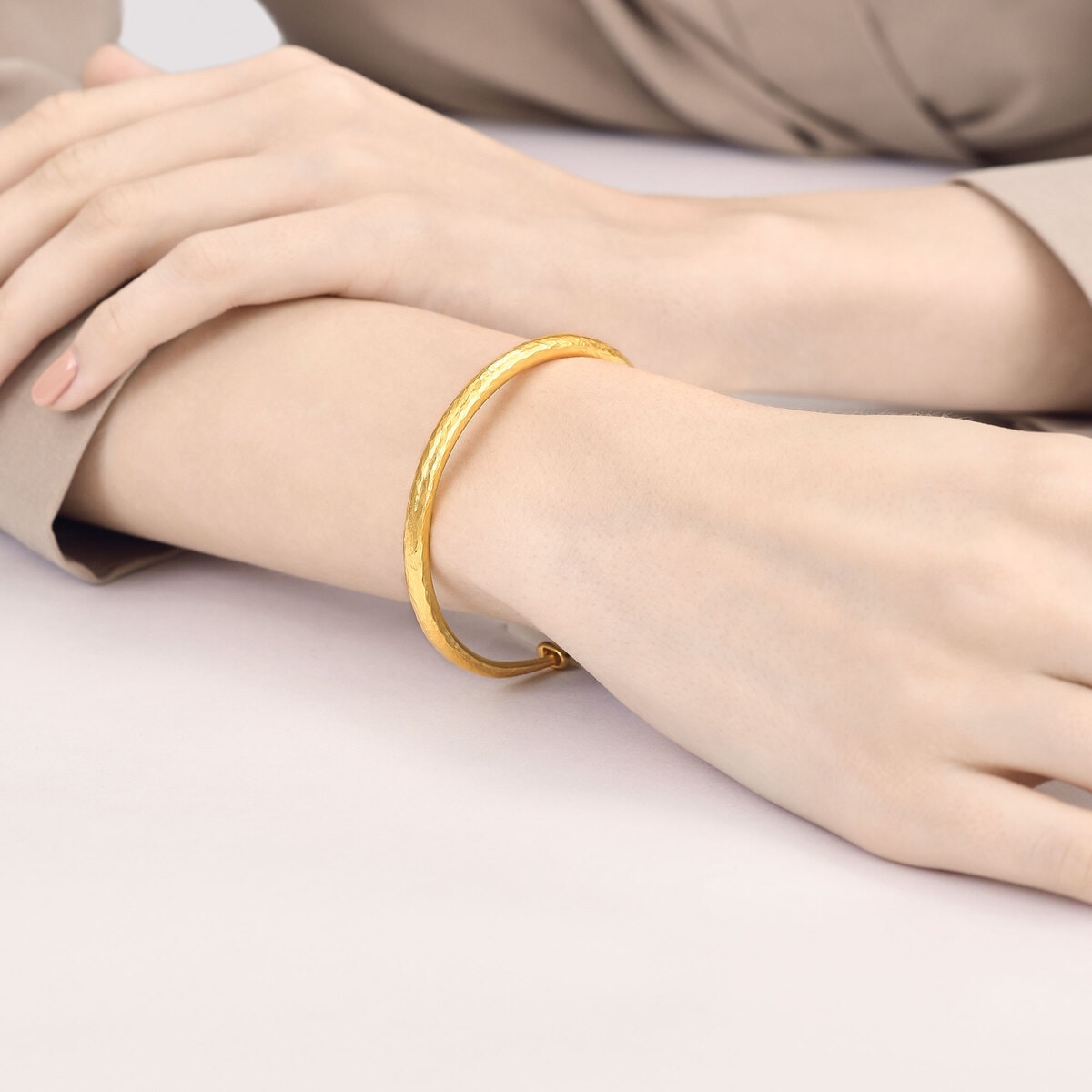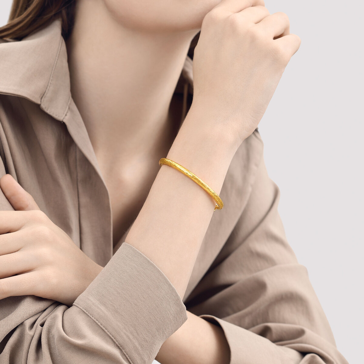 Chow Sang Sang - Forged in precious ancient gold, this gold hollow bangle from 'The Oriental' features a hammered design to exude the beauty of Oriental culture. Engraved with "bamboo" and "bat," a homonym of "blessings" in Chinese, it signifies the auspicious wish of peace and good luck.