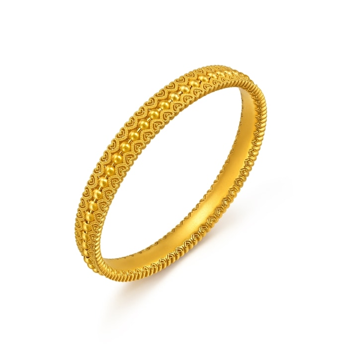 Chow Sang Sang - Exquisitely crafted in Hard Solid Gold with 3D Printing Technique, this gold bracelet showcases intricate layers of gold threads forming a dimensional interlinked heart motif, centred by rotating beads. Symbolising eternal blessings and fortune’s turn, its elegant design embodies auspicious harmony.