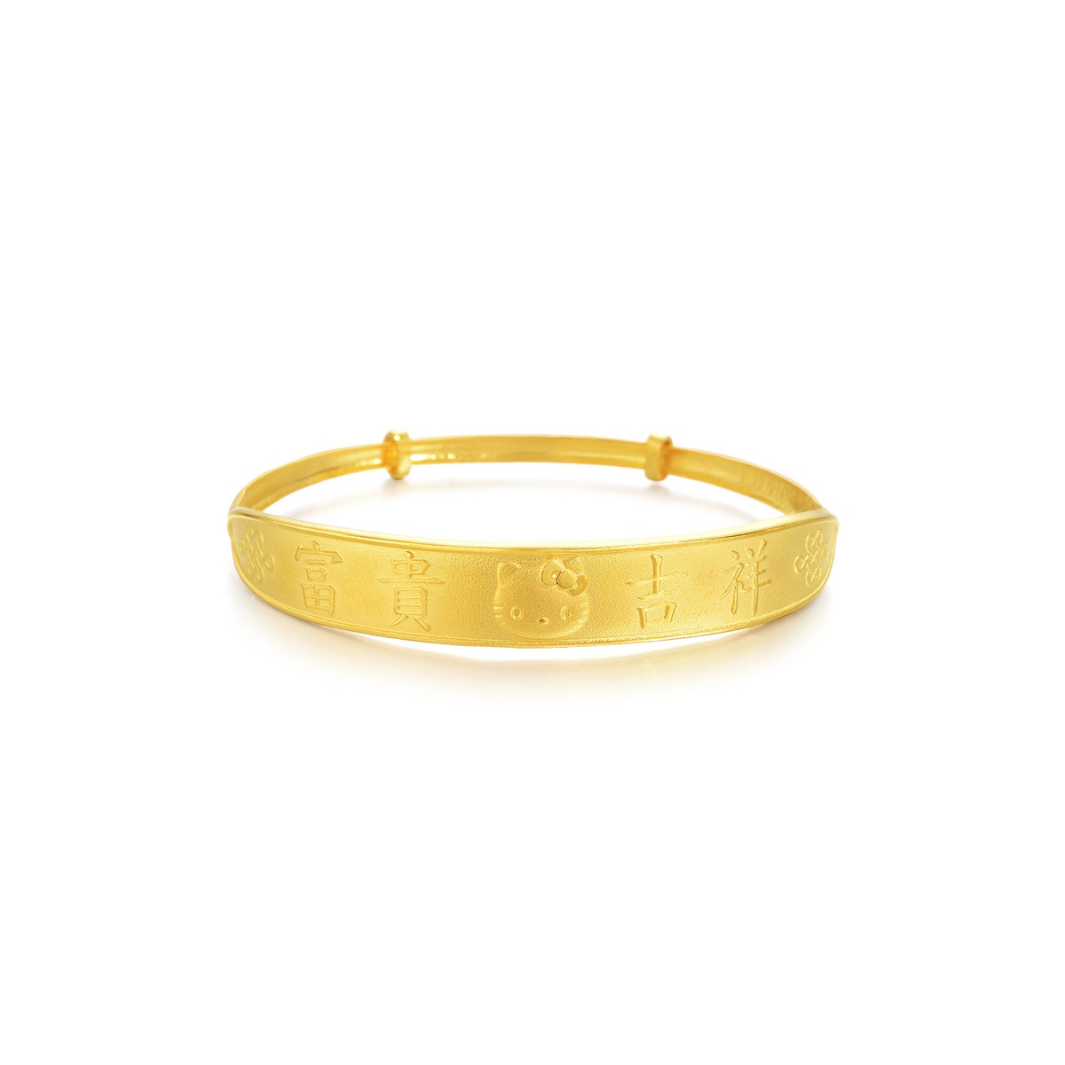 以Hello Kitty造型的「彌月系列」金手鐲,打破一貫金器予人傳統守舊的感覺。配以Hello Kitty的經典造型,刻有祝福語「富貴吉祥」,祝願龍寶寶快高長大,如意吉祥。