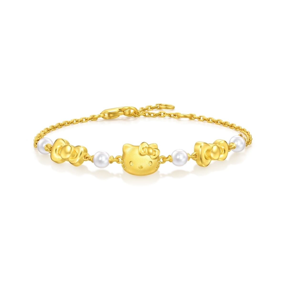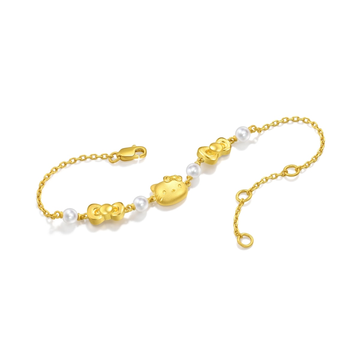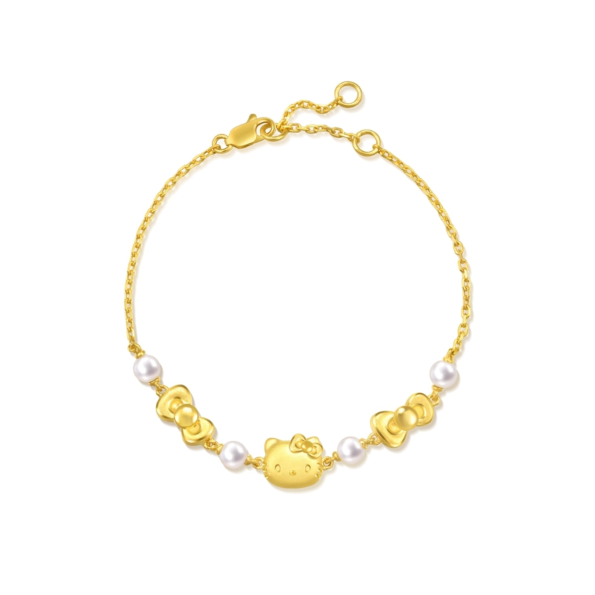 Chow Sang Sang - This gold bracelet incorporates Hello Kitty as its design element. It is crafted with sandblasting to create its delicate texture. The bracelet is specially crafted with natural pearl material, intertwining with Kitty's iconic bow