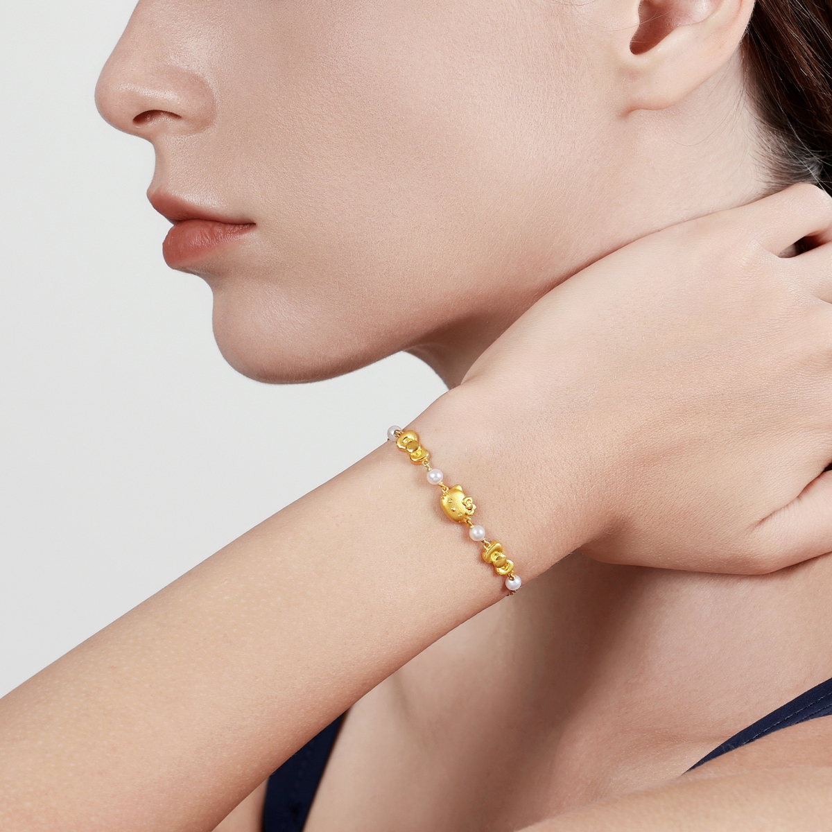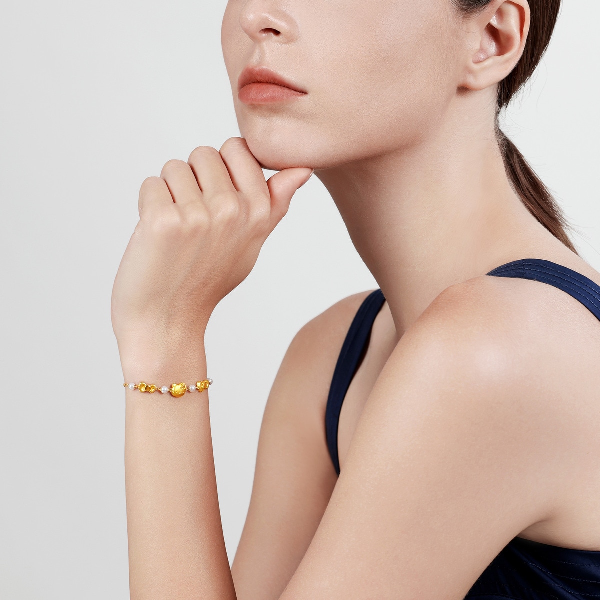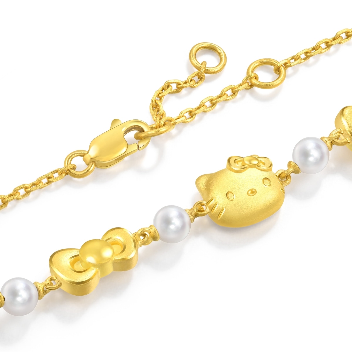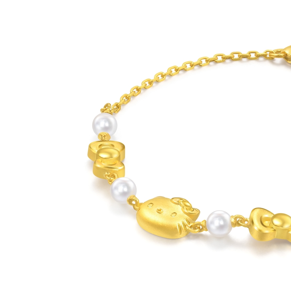 Chow Sang Sang - This gold bracelet incorporates Hello Kitty as its design element. It is crafted with sandblasting to create its delicate texture. The bracelet is specially crafted with natural pearl material, intertwining with Kitty's iconic bow