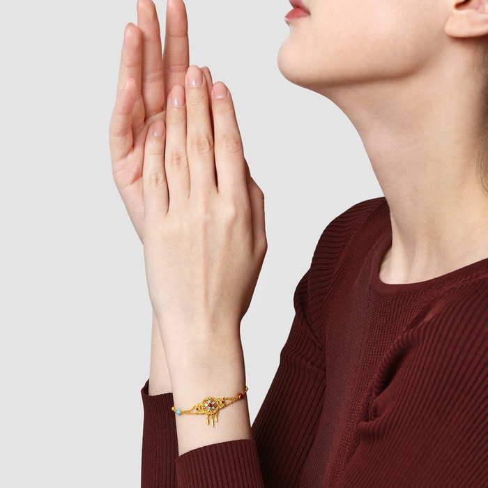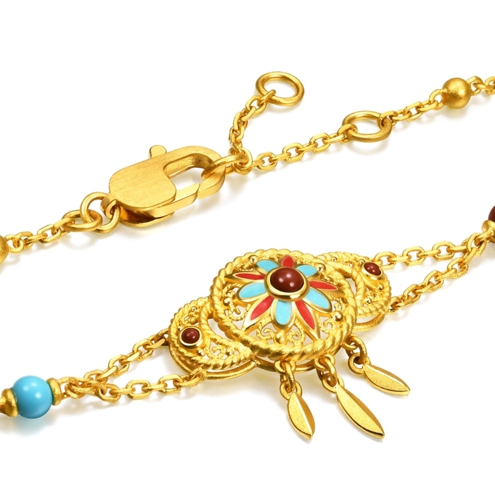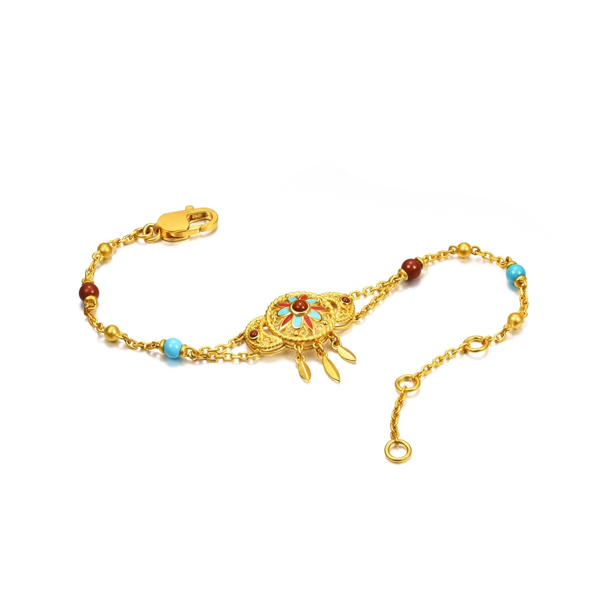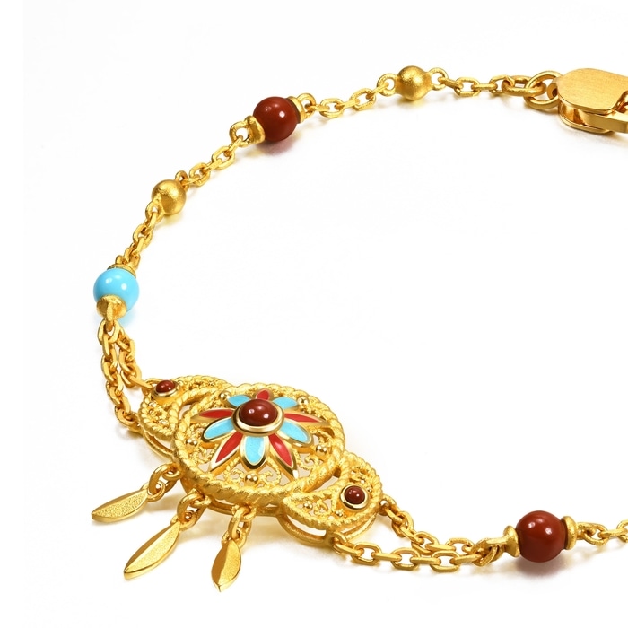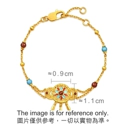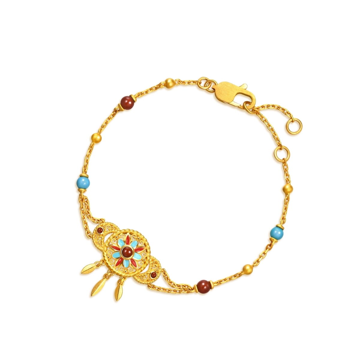周生生足金手鏈帶有濃厚民族色彩,中心以彩繪塗色及紅玉髓展現太陽的溫暖與熱情,底層綴以細膩花絲,立體有致。