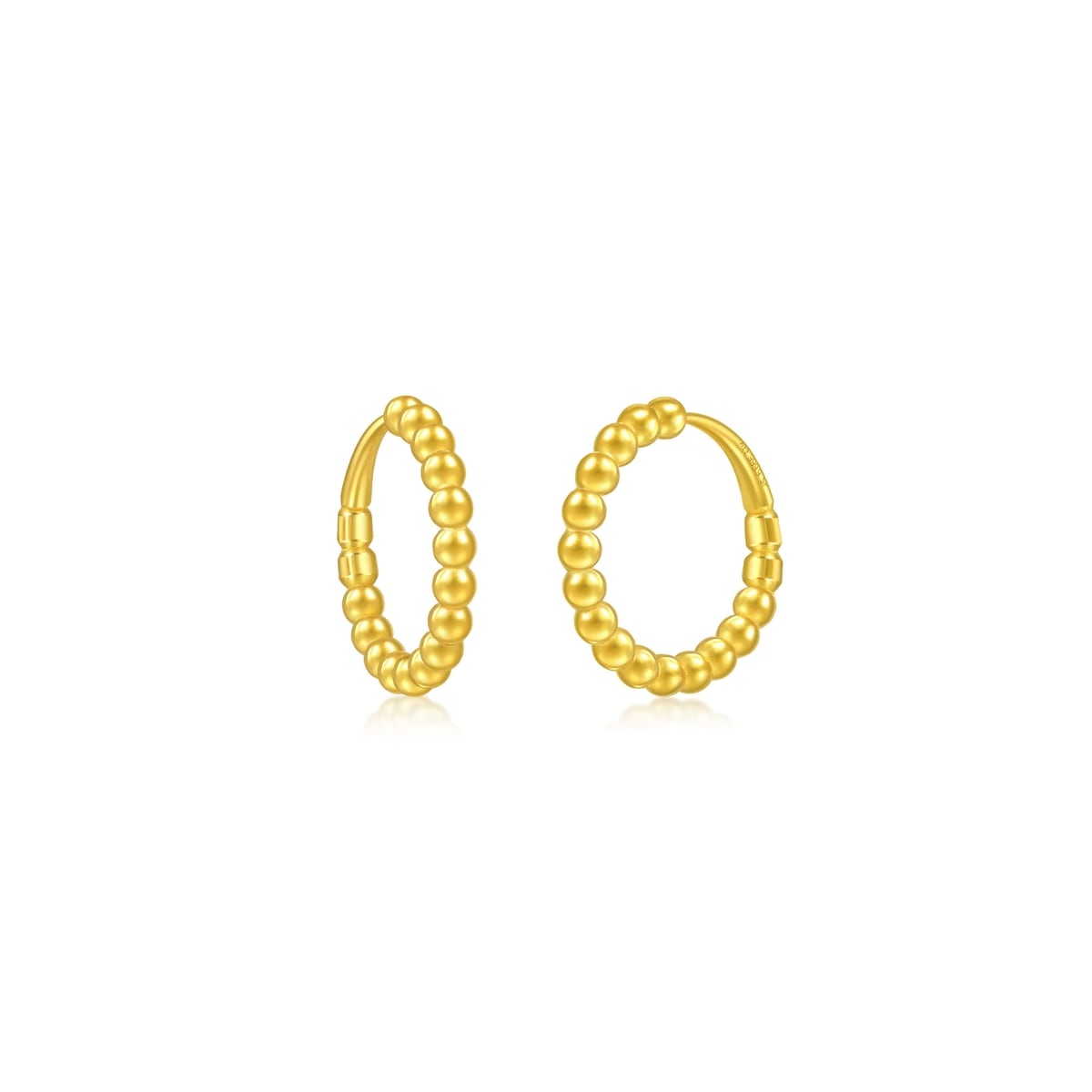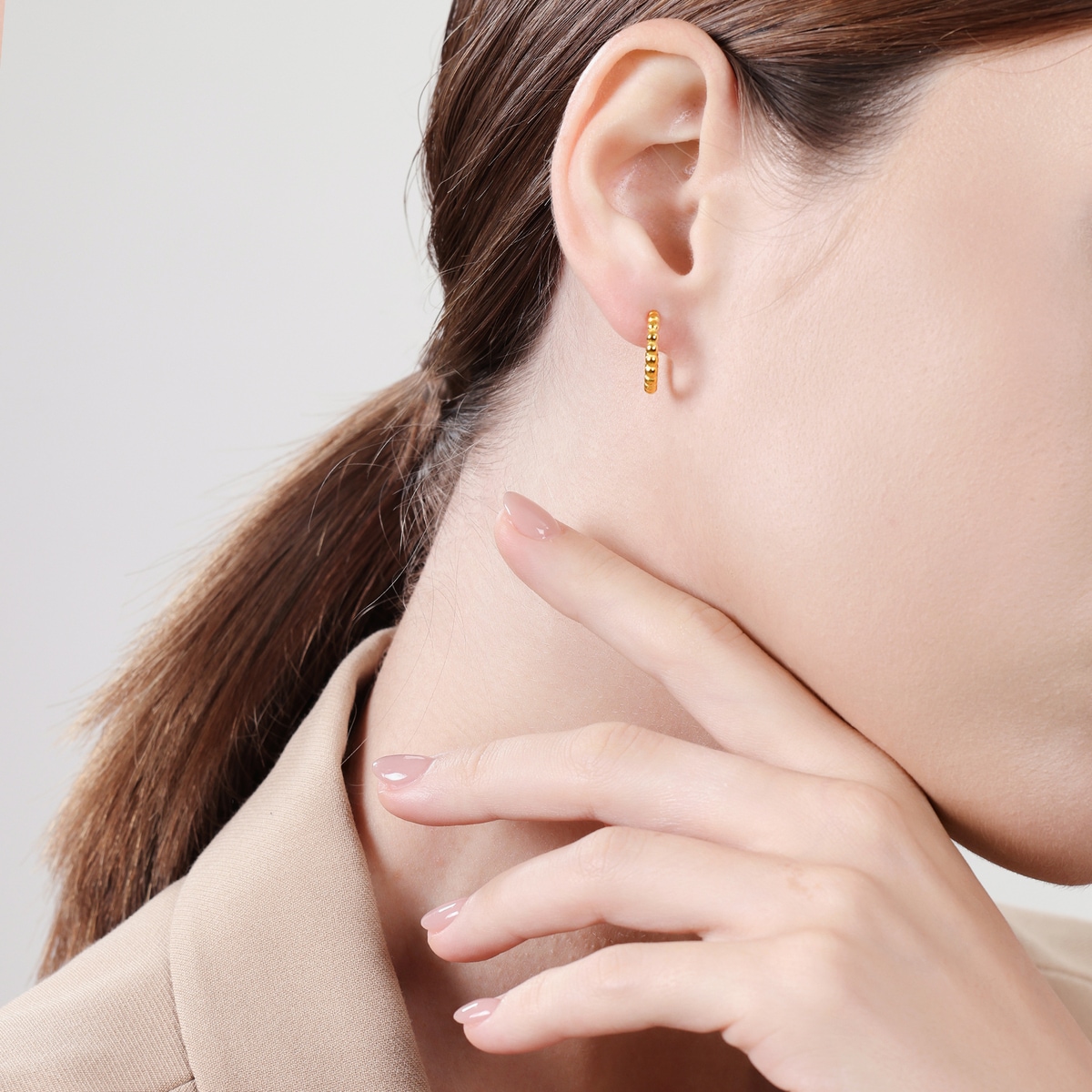These gold earrings combine a circle and bead design, infusing fashionable elements into classic aesthetics. They exude an elegant and fresh look, suitable for pairing with various everyday outfits.