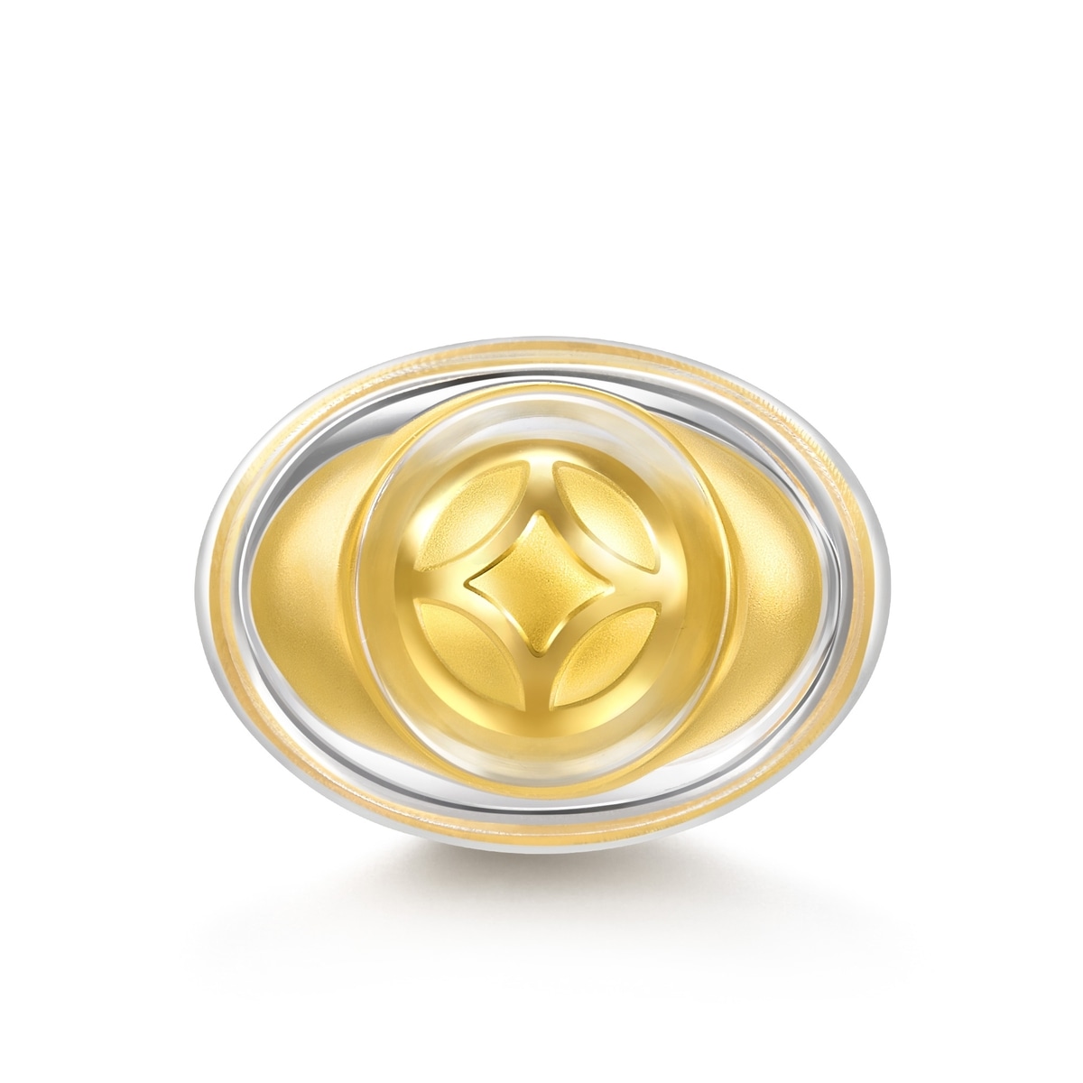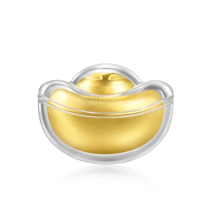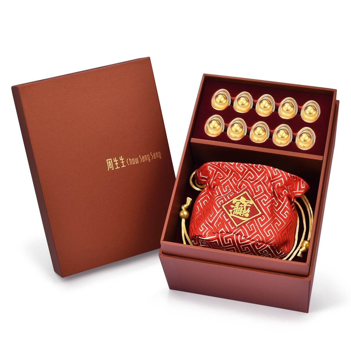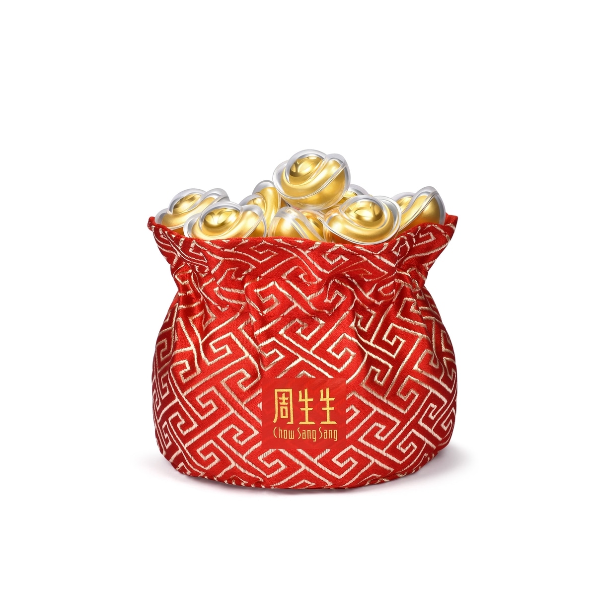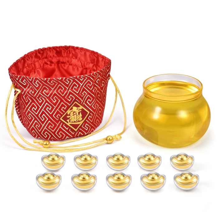Chow Sang Sang - This gold ornament, inspired by the 'treasure basin', holds ten coin-patterned gold ingots symbolising perfection and abundance. Encased in a detailed brocade bag with motifs for wealth and prosperity, it signifies ongoing affluence and is highly prized by collectors.