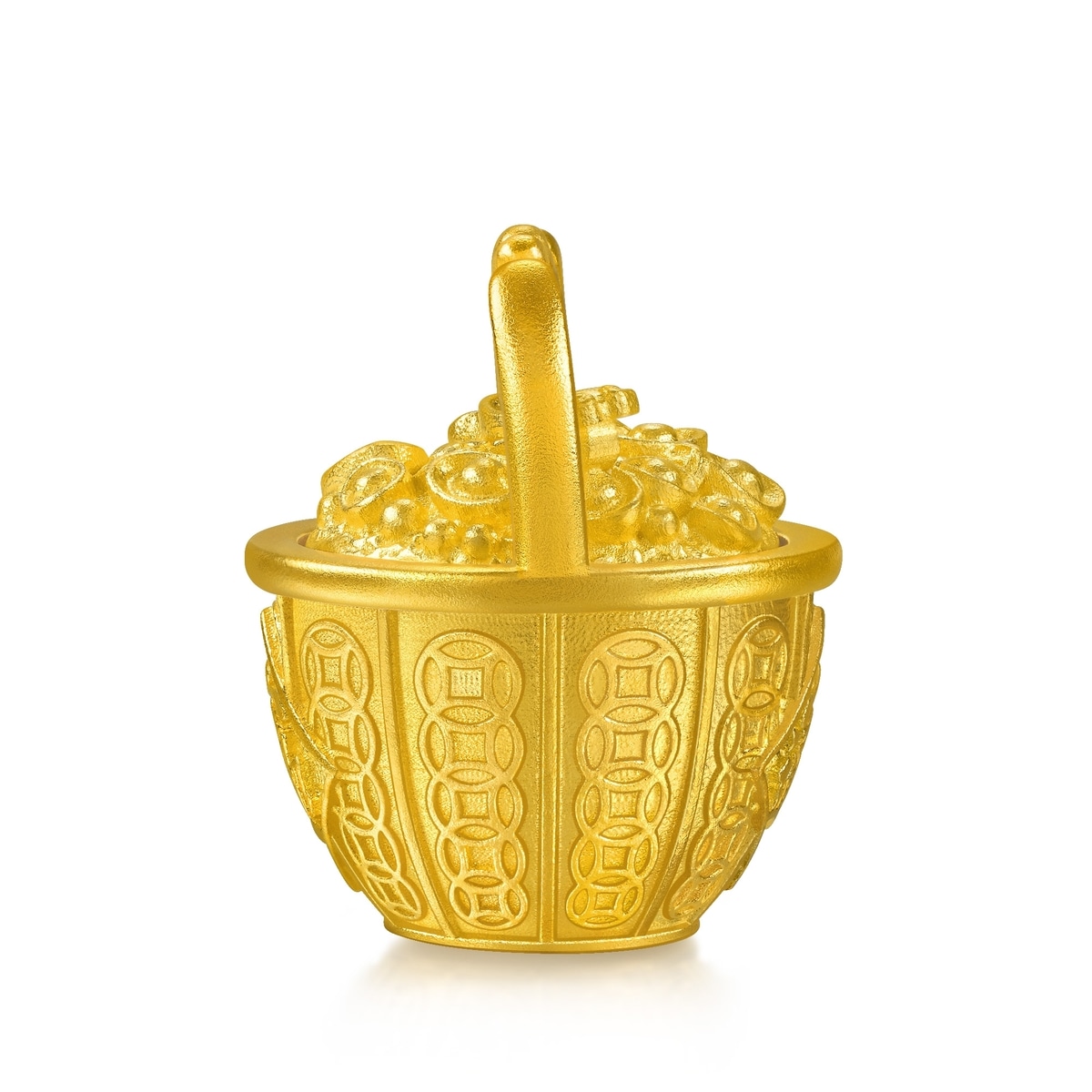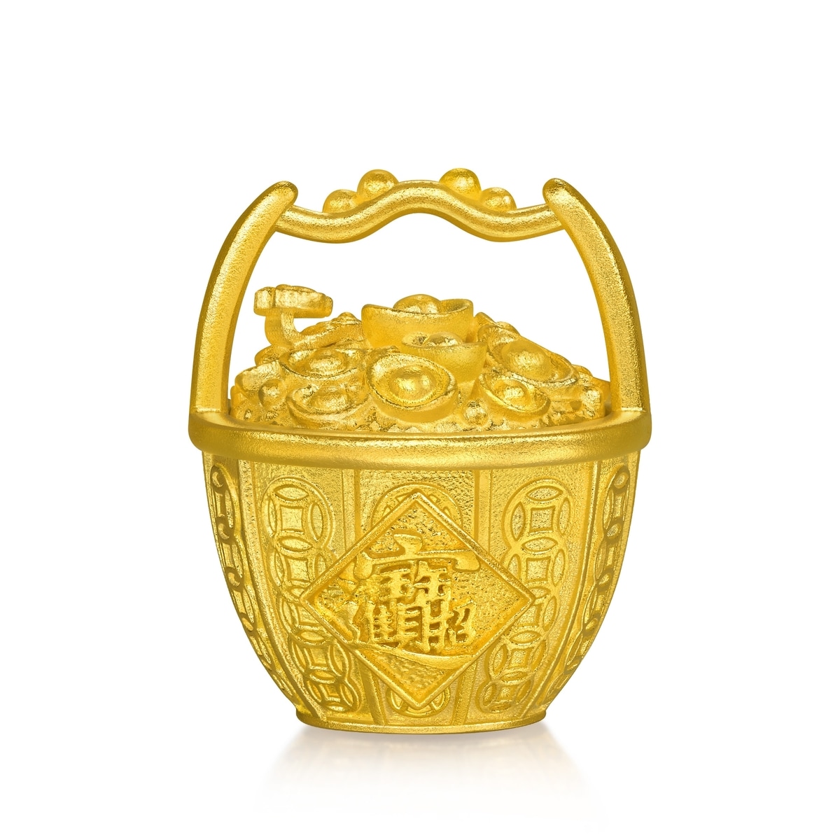 Chow Sang Sang - This exquisite miniature gold treasure bucket features intricate engravings. Its detachable lid reveals a hollow interior brimming with golden riches, symbolising prosperity and abundance. This collectable piece embodies both artistry and auspicious fortune.