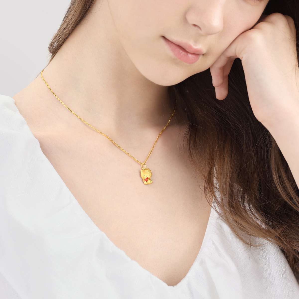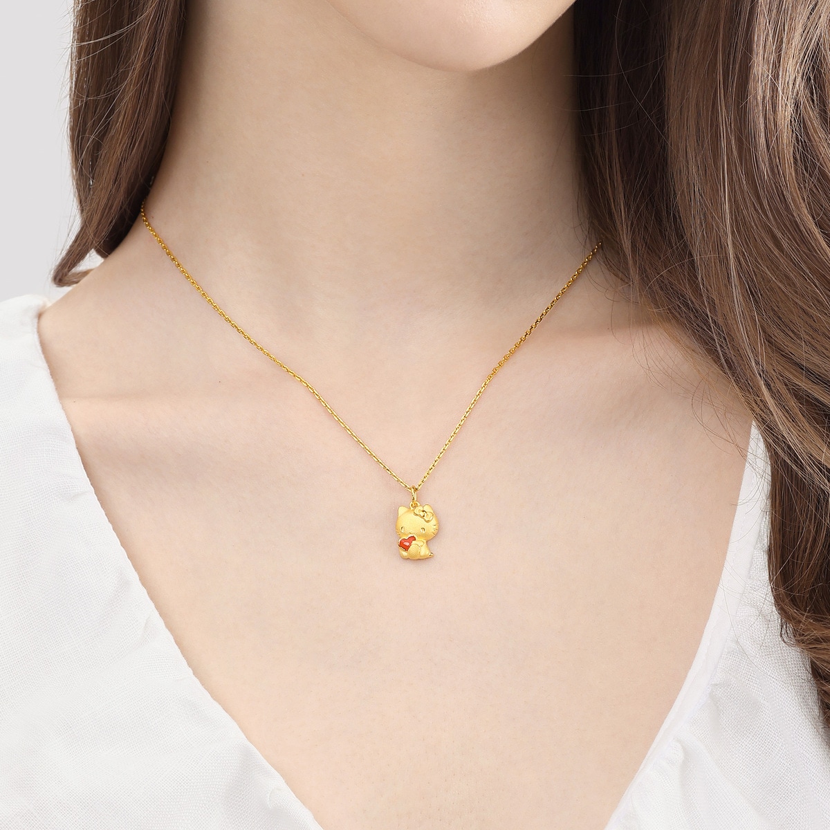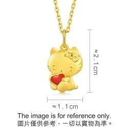 周生生足金吊墜以手抱愛心的Hello Kitty為設計元素,表面採用噴砂表面處理技術,營造細膩質感,結合彩繪塗層工藝,呈現繽紛色彩,吊墜造型飽滿細緻、活潑生動,就讓可愛甜美的Hello Kitty為妳守護愛情。