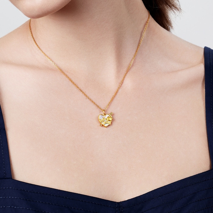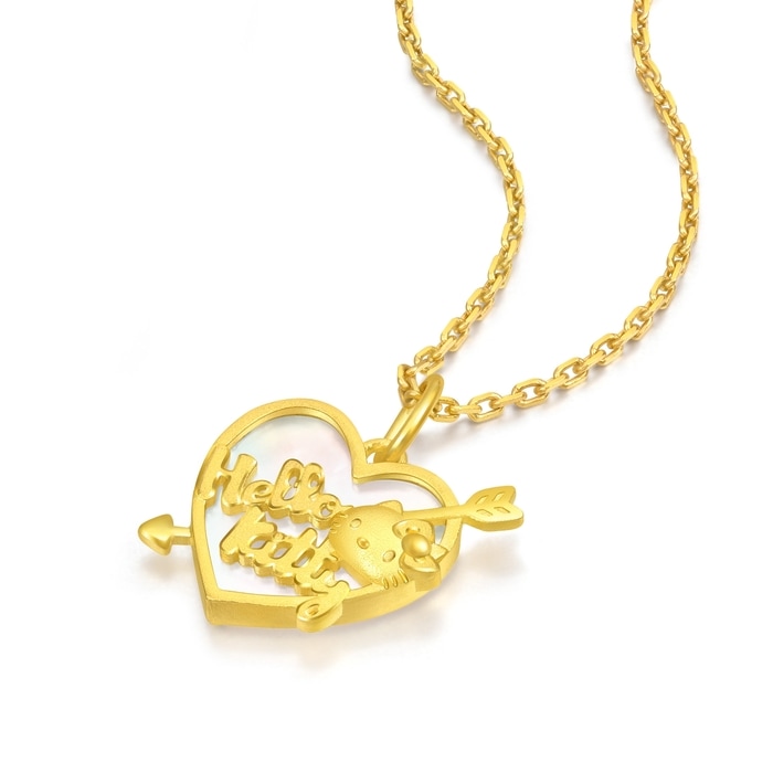 This gold pendant features Hello Kitty with Cupid's arrow, crafted with mother of pearl, showcasing a delicate texture and creating a romantic and sweet style.