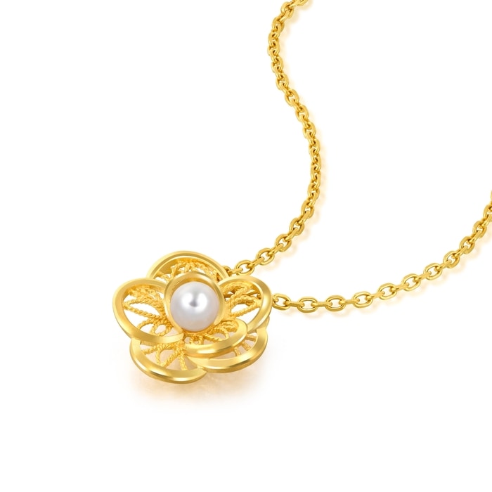 Chow Sang Sang - Taking design inspiration from hollow carving techniques of Orissa, India, this elegant gold flower pendant features the lace-like pattern and a centered iridescent freshwater cultured pearl.