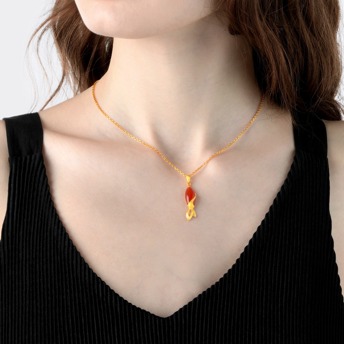 以牡丹金魚為主題的吊墜,結合紅瑪瑙與黃金的高貴優雅,以流麗的現代筆觸,演繹時尚與傳統的平衡之美。
