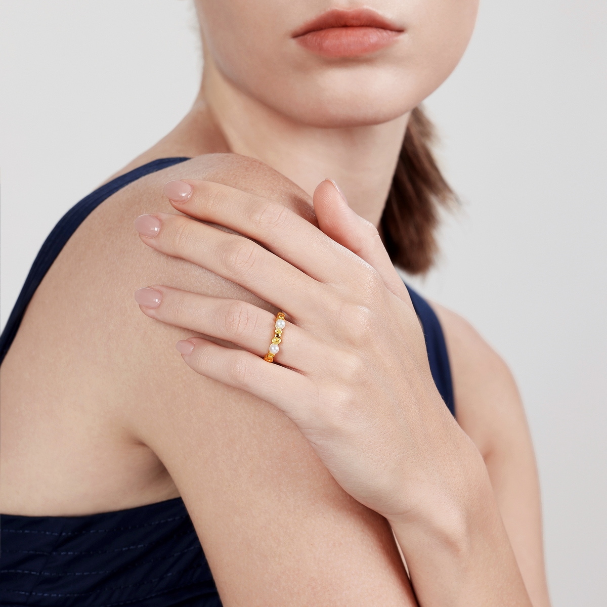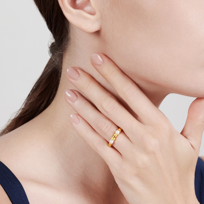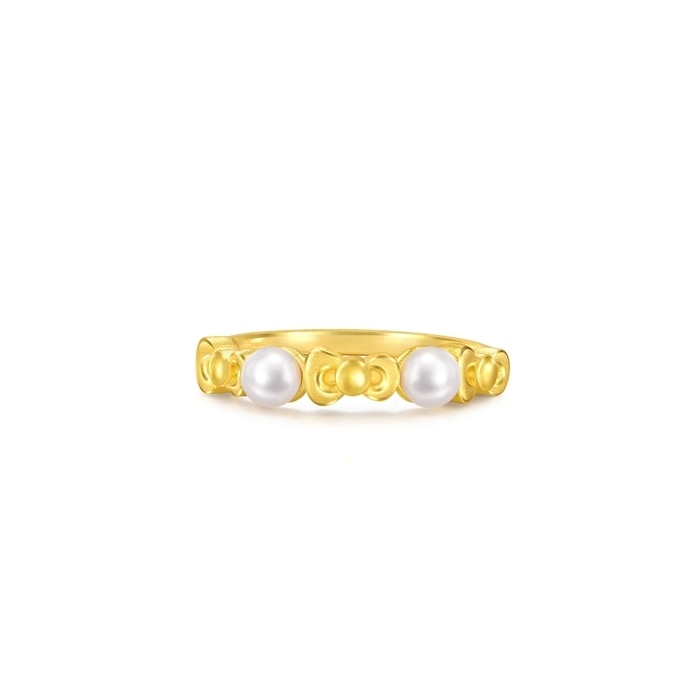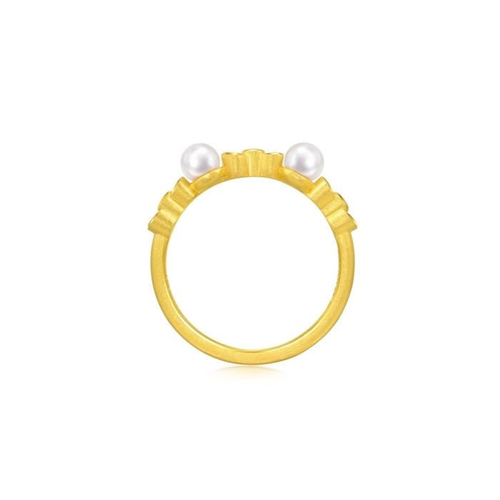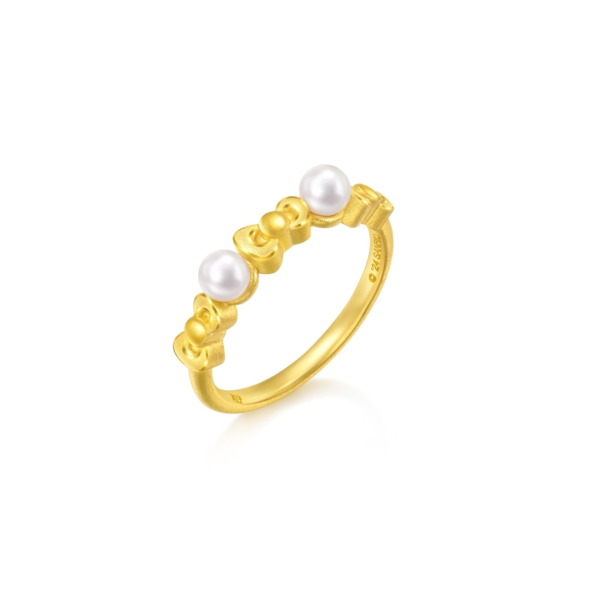Chow Sang Sang - This gold ring incorporates Hello Kitty as its design element. It is crafted with sandblasting to create its delicate texture. The ring is specially crafted with natural pearl material, intertwining with Kitty's iconic bow