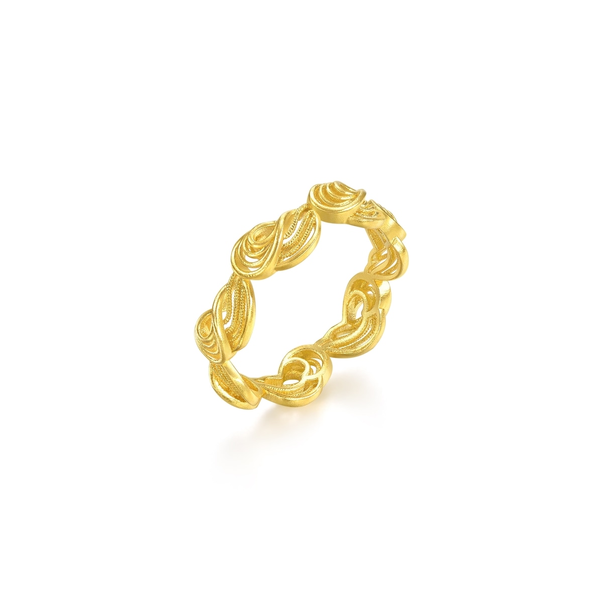 This gold ring is crafted using the filigreeing technique to create a three-dimensional finish. The design is inspired by waves sparkling under the sunlight, rising layer by layer on the sea's surface, symbolising vitality and courage while embodying boundless joy.