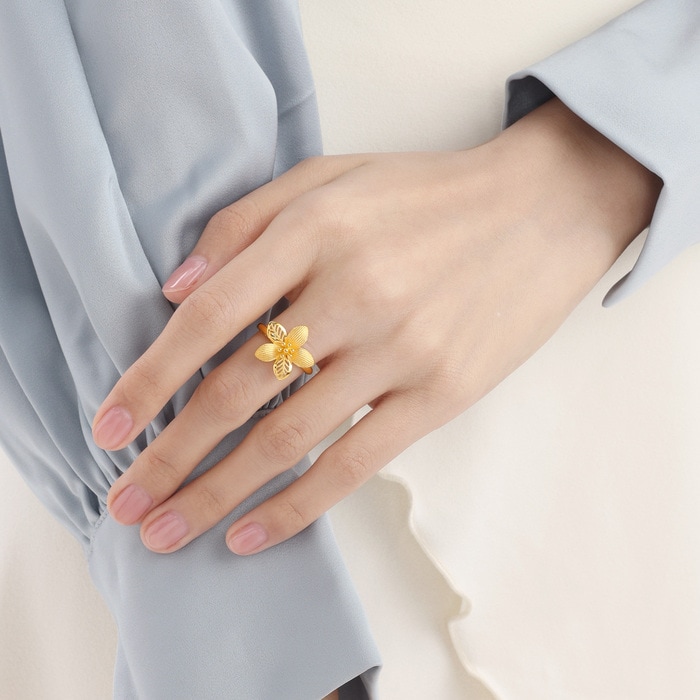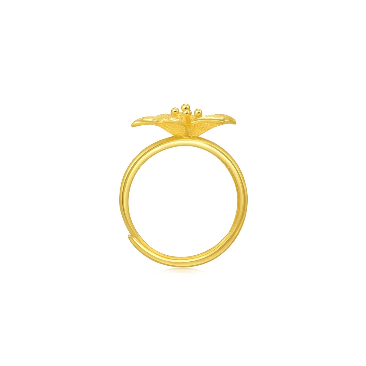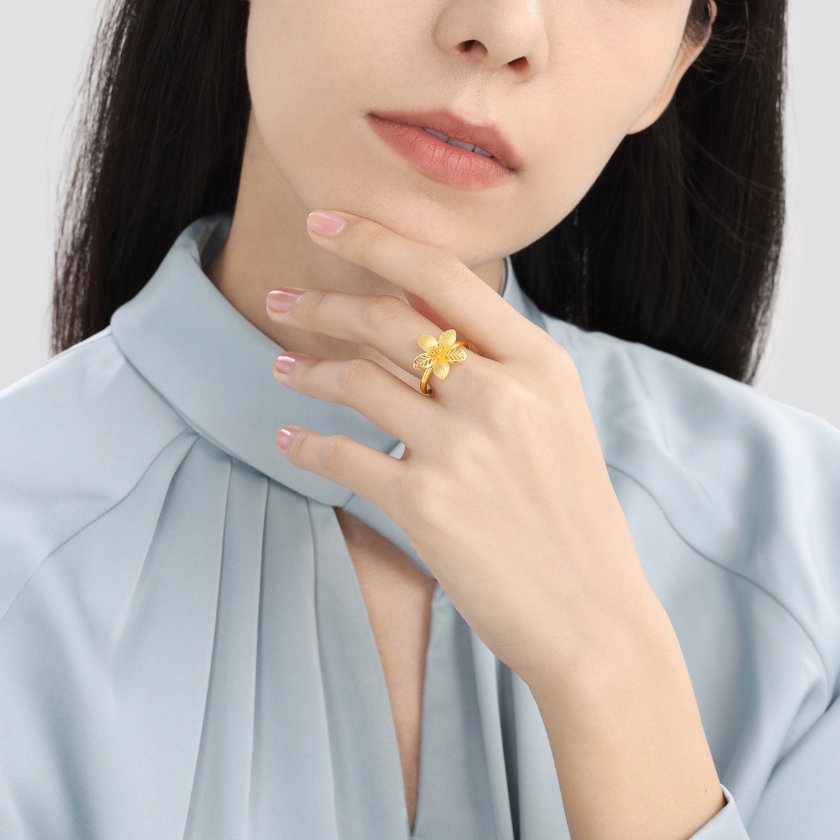 Chow Sang Sang - 999 Gold ring features a romantic peach blossom design, with five petals and an intricate hollow design. Symbolizing love, it wishes newlyweds a lifetime of happiness.