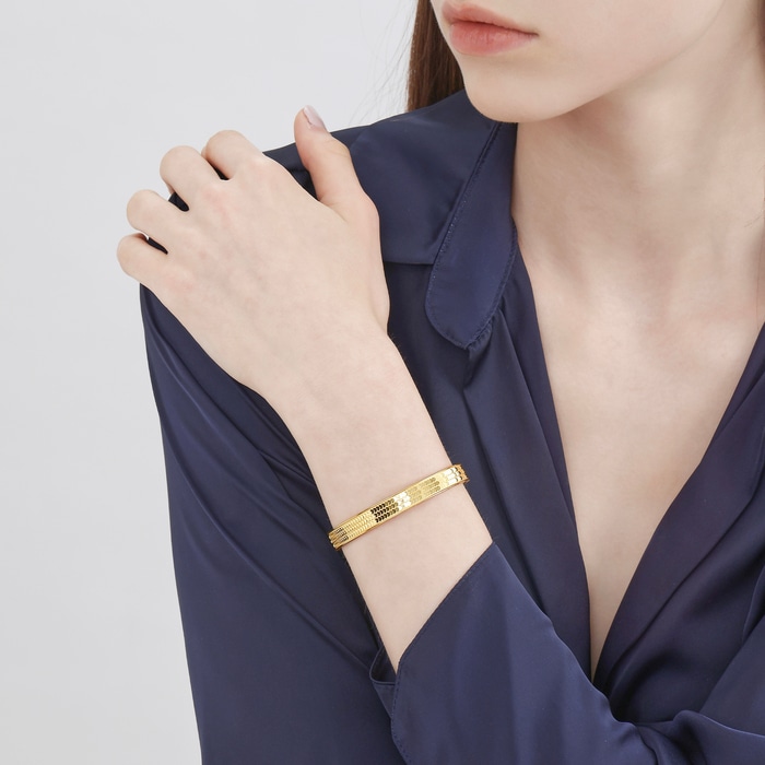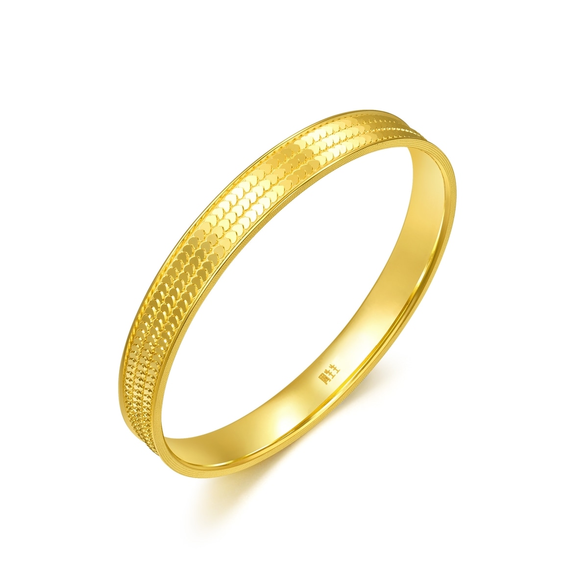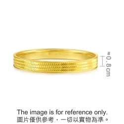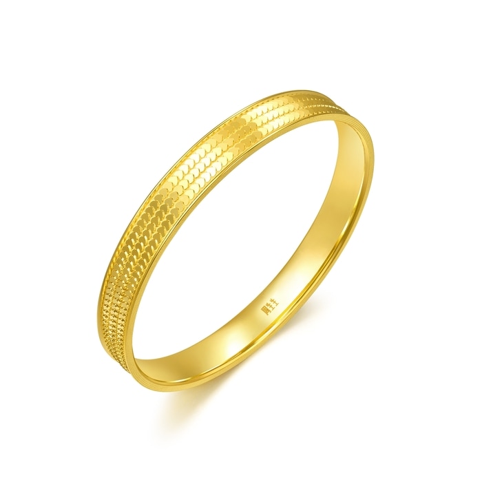 周生生足金實心手鐲採用創新5G黃金技術,令黃金硬度大大提升,配以多元黃金工藝,打造出更精緻的足金飾品。手鐲以鱗片設計疊搭出心形圖案,造型立體、層次豐富,呈現炫目時尚切面,打造出高光鏡面效果,從不同角度反照出耀眼光芒。飾品將先進工藝注入潮流美學,成為黃金飾品的時尚新寵。