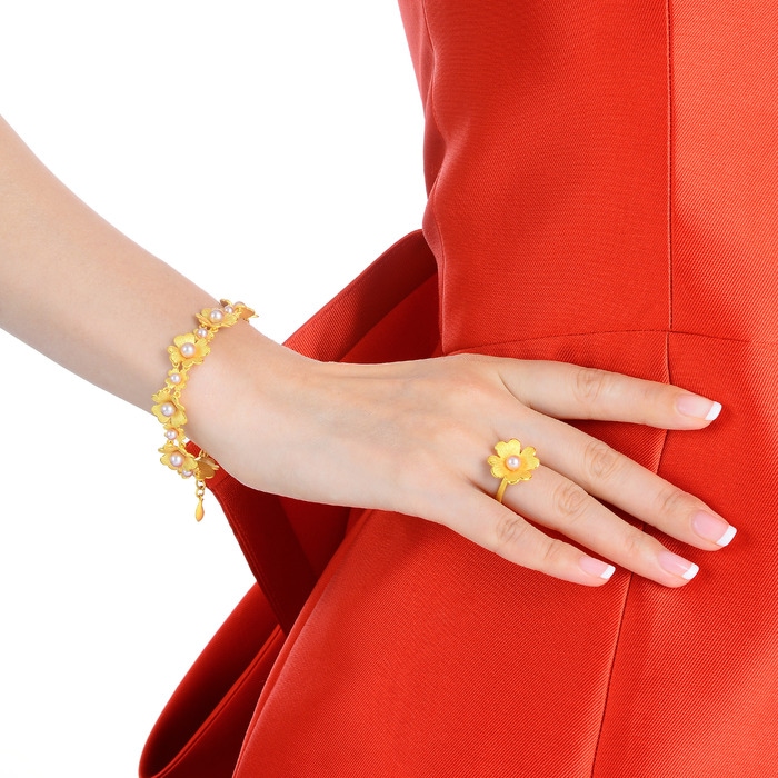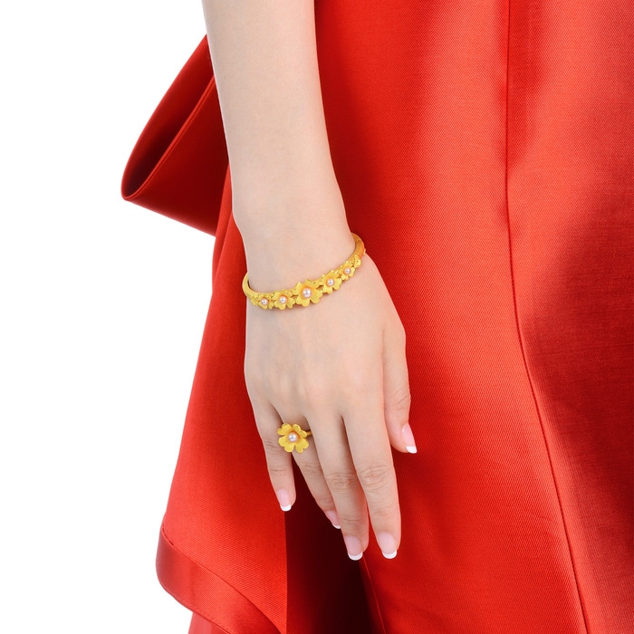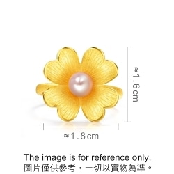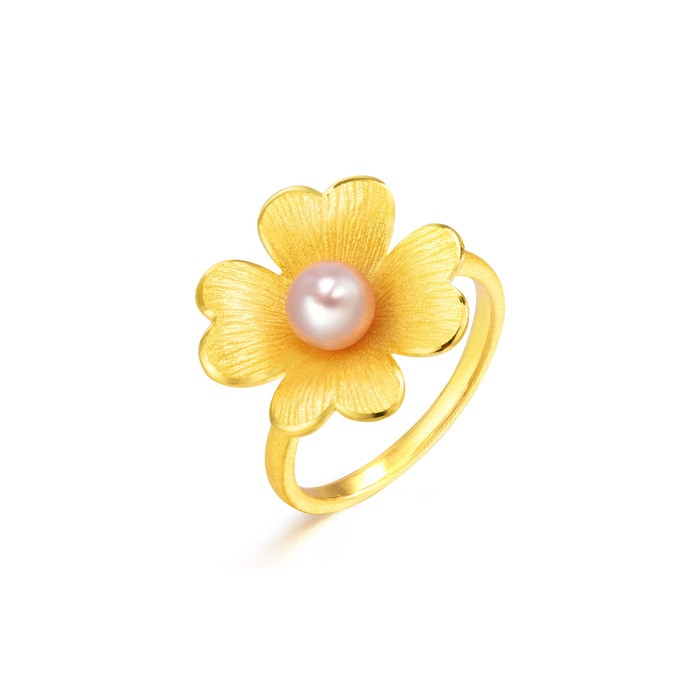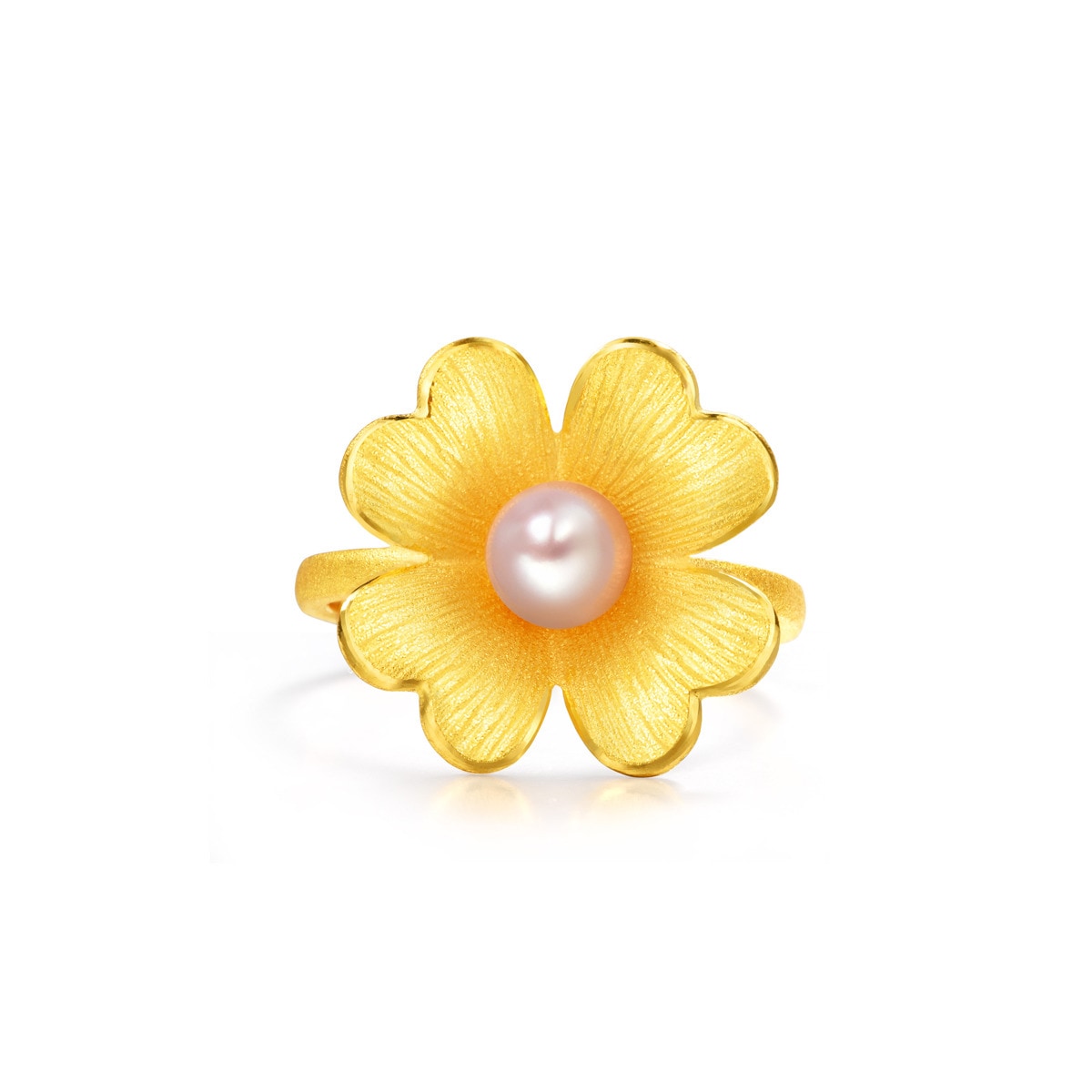 周生生戒指以滿載祝福的四葉草為設計主調,配合拉絲工藝,令紋理更突出。每朵四葉草都鑲嵌著一顆圓潤珍珠,光澤柔和,高雅別致。