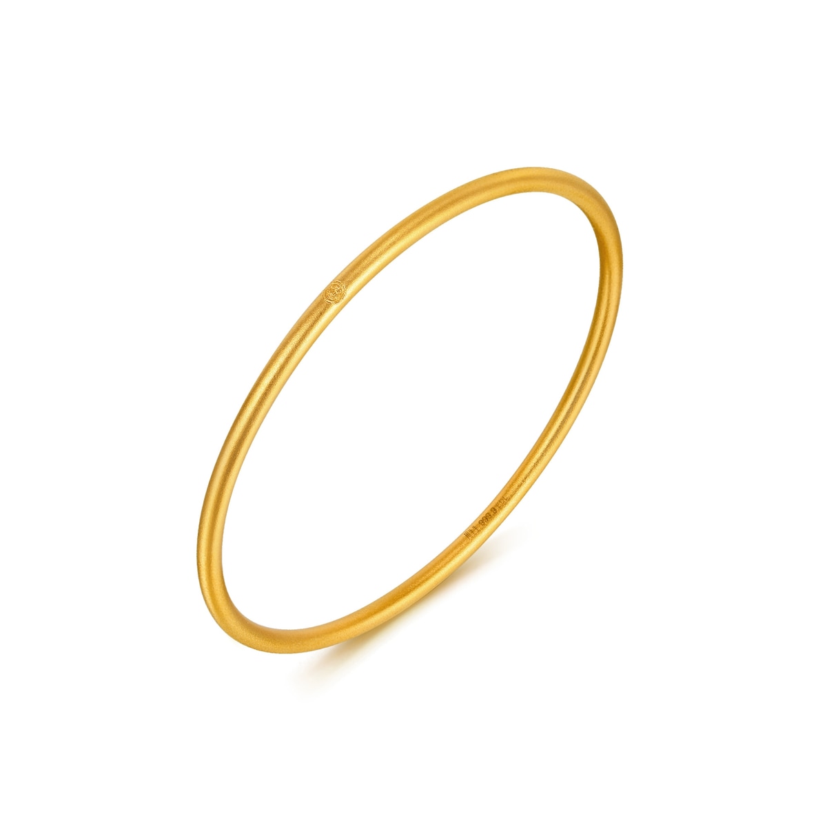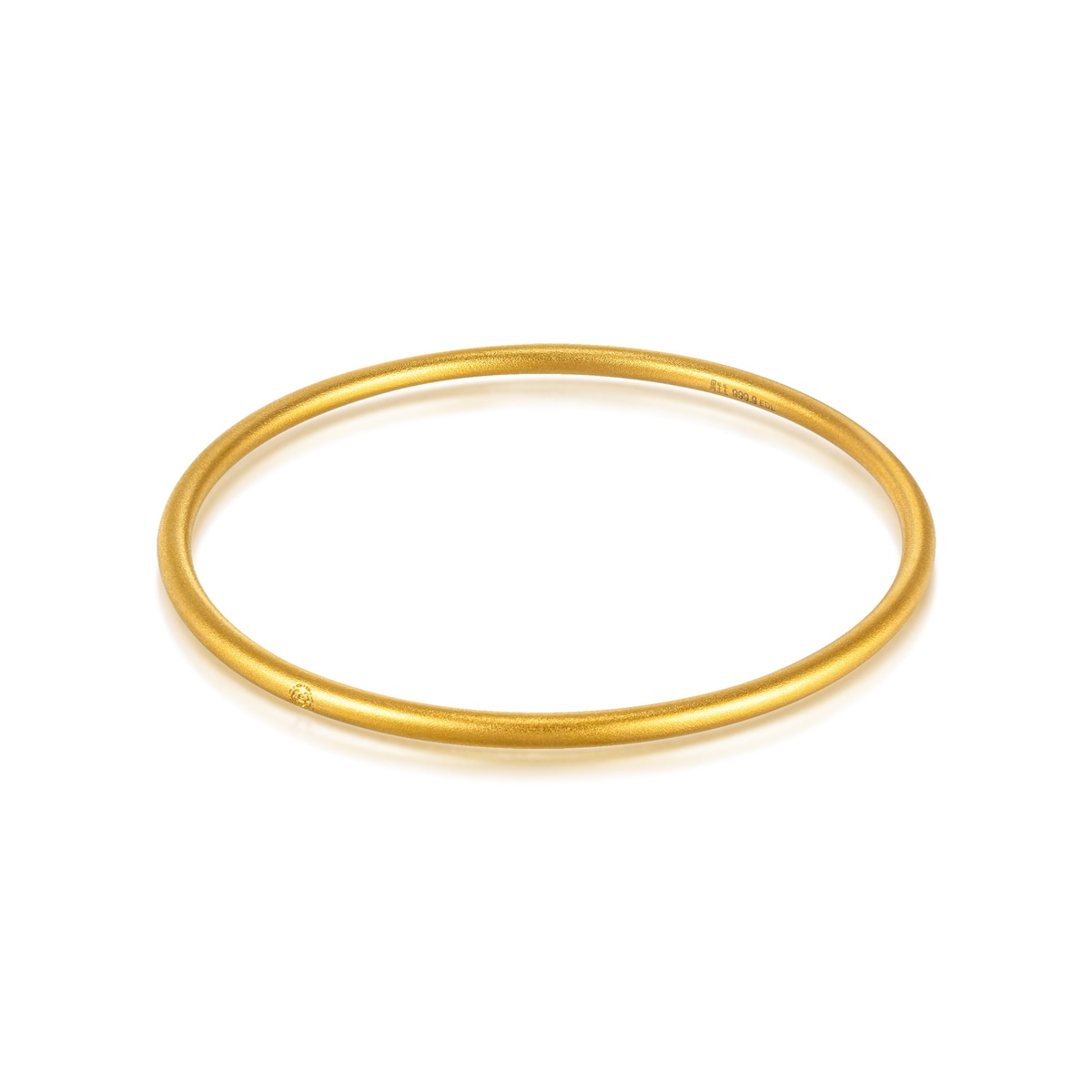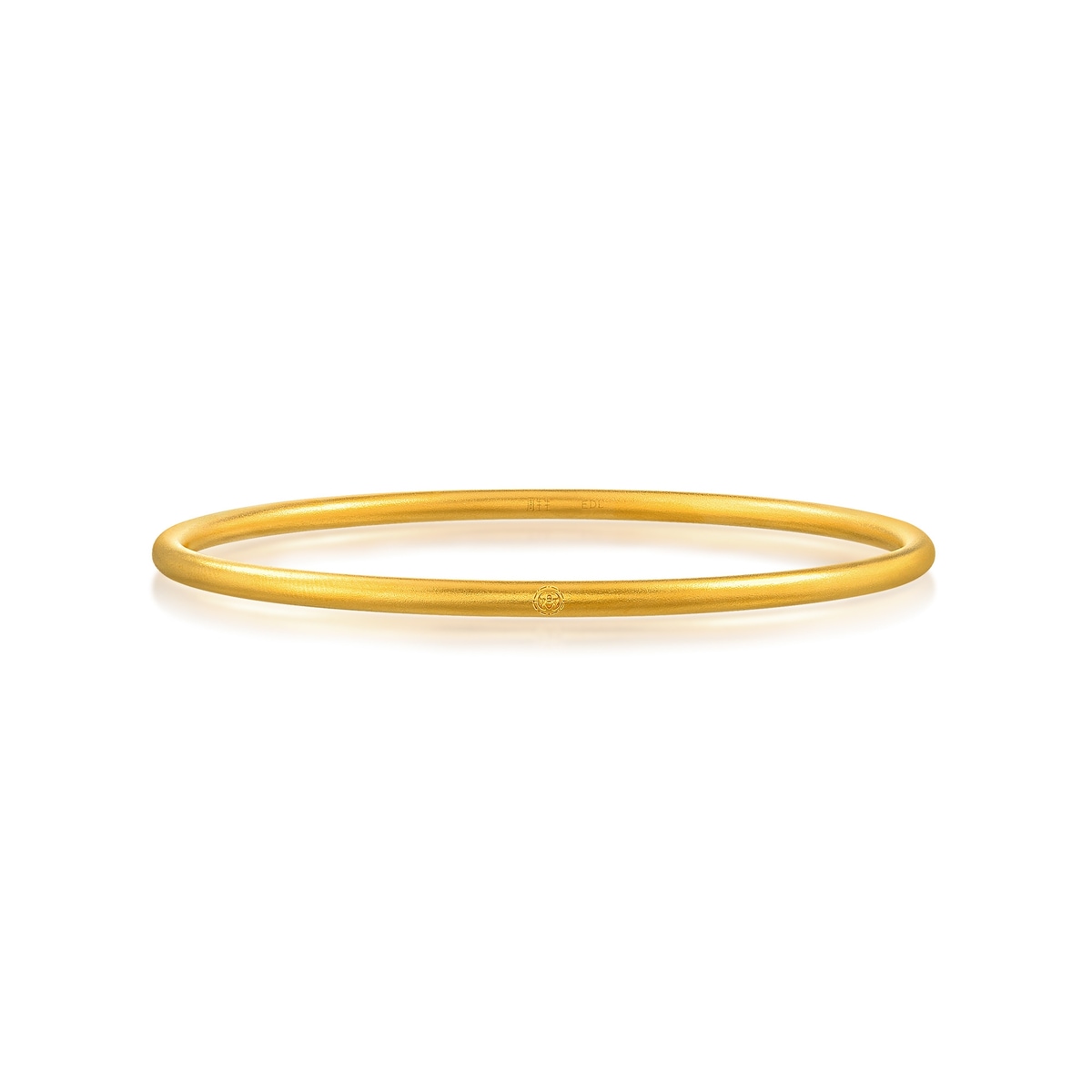 周生生圓棍實心足金手鐲以古祖黃金工藝打造,份量十足,設計簡約,表面經噴砂處理,呈細緻啞光質感。手鐲上印有專屬「竹」「蝠」印記,寓意「祝福」滿滿之意。