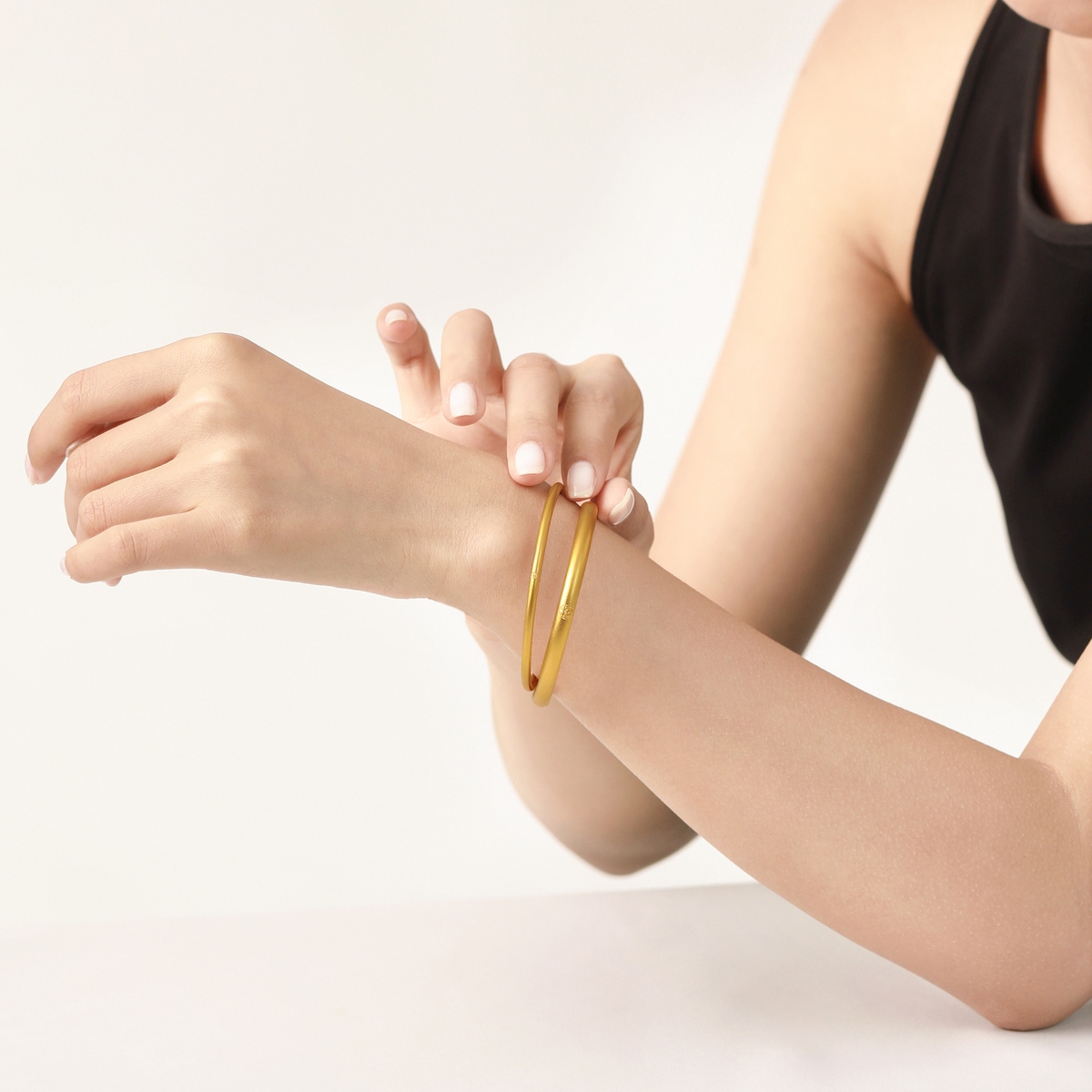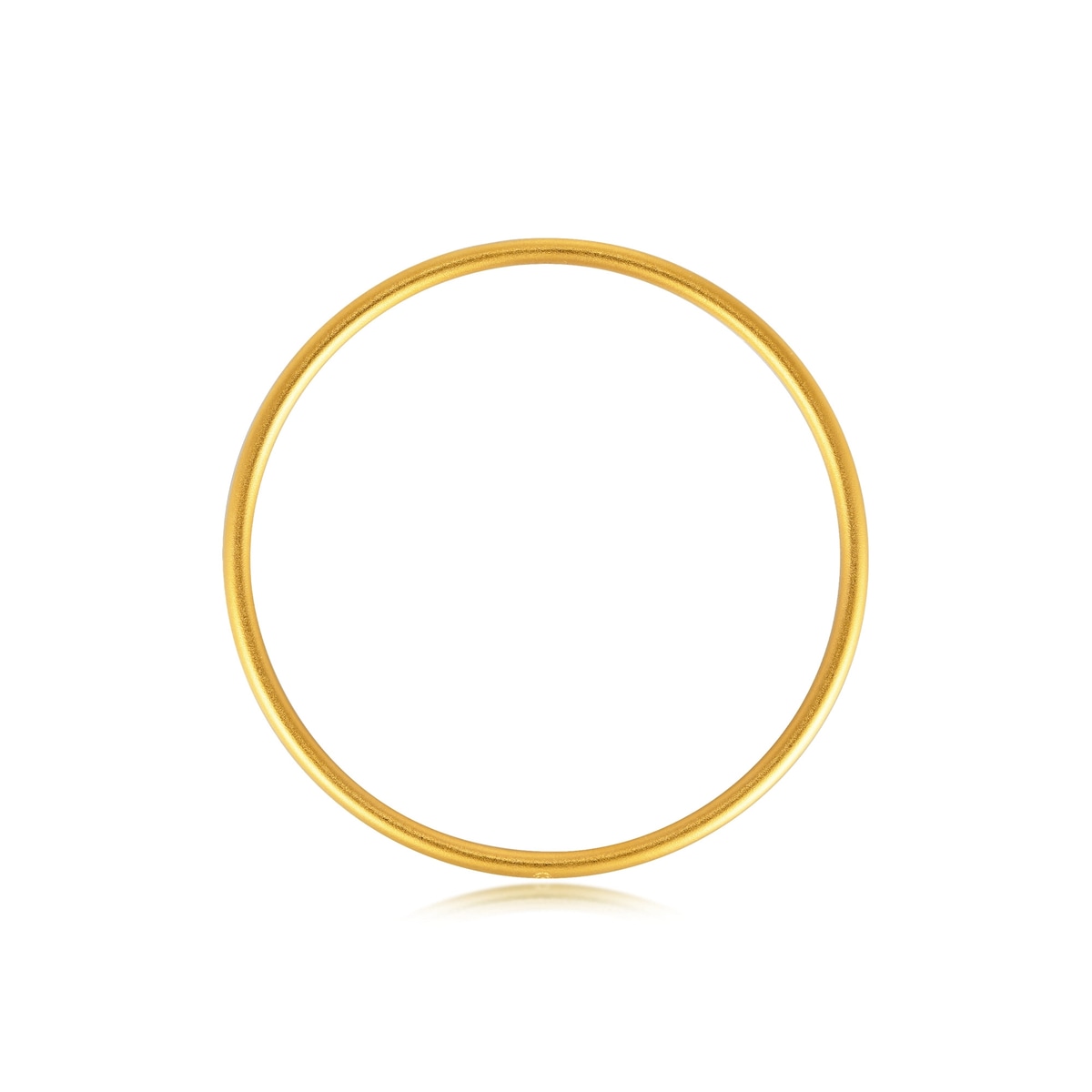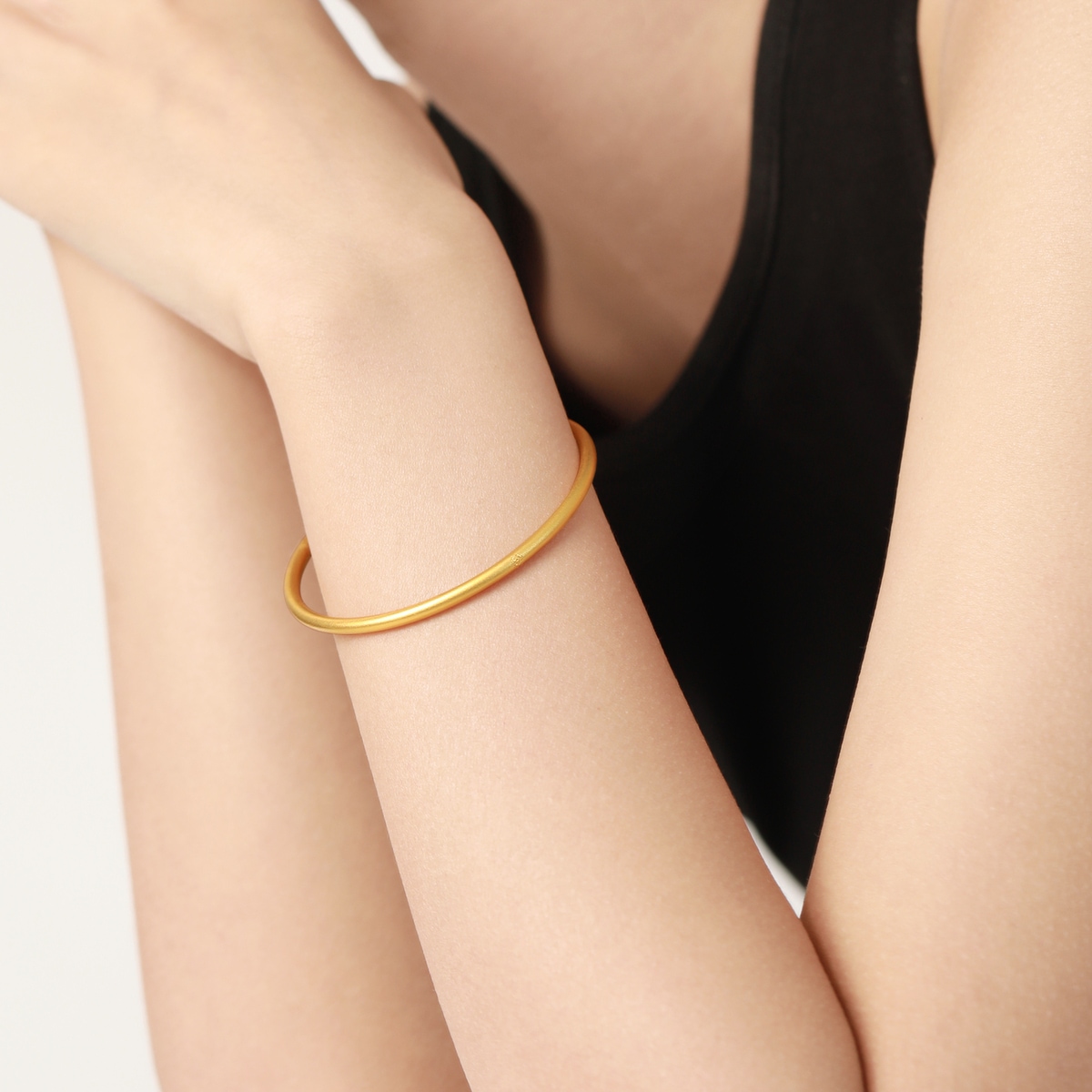 周生生圓棍實心足金手鐲以古祖黃金工藝打造,份量十足,設計簡約,表面經噴砂處理,呈細緻啞光質感。手鐲上印有專屬「竹」「蝠」印記,寓意「祝福」滿滿之意。