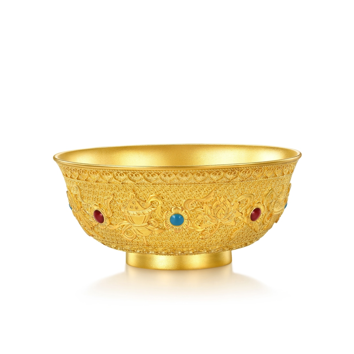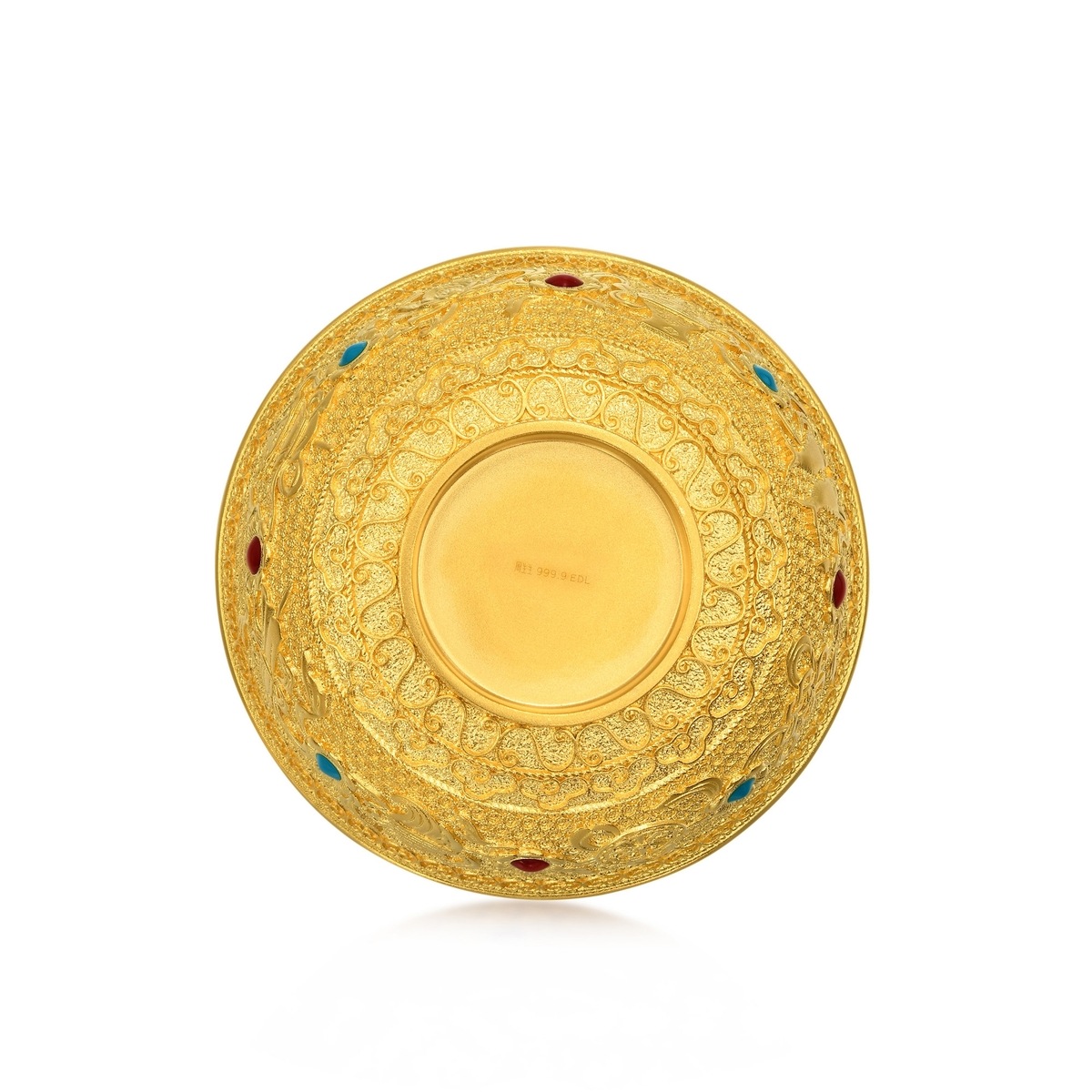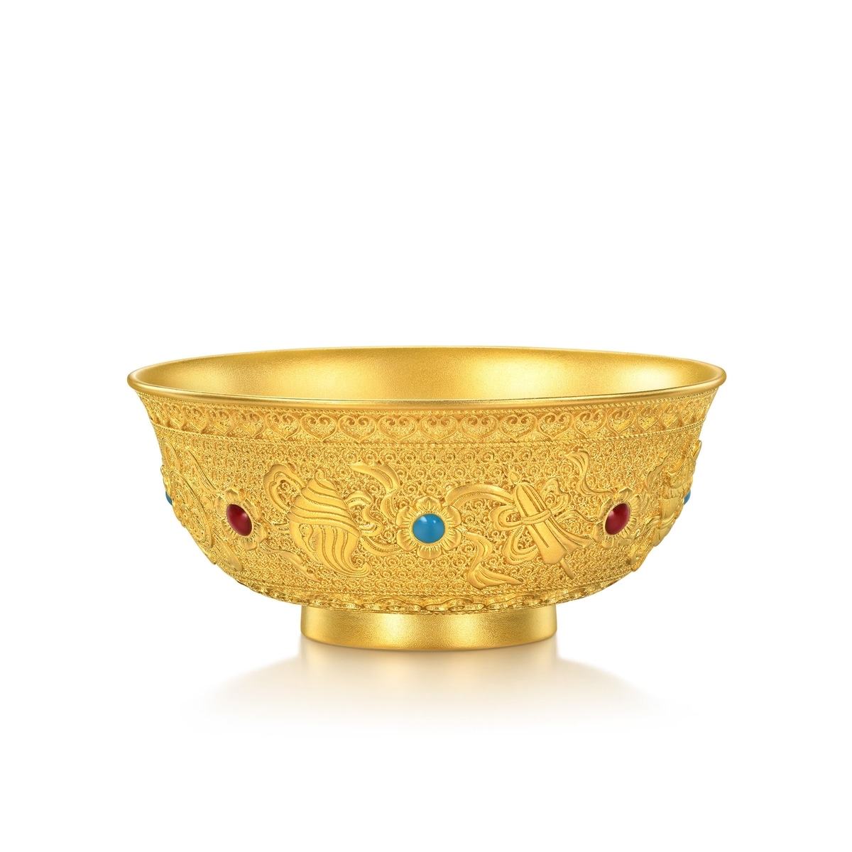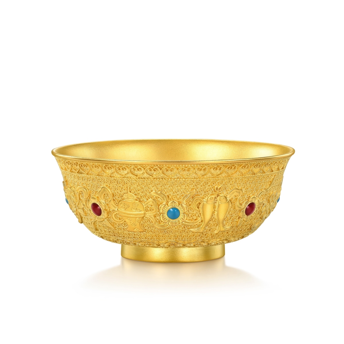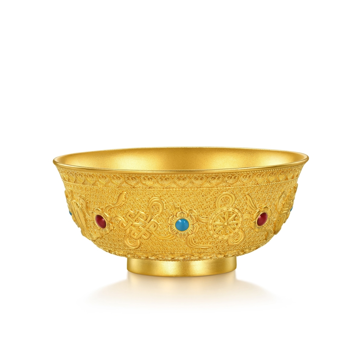 周生生足金八吉祥金碗,以象徵豐衣足食的金碗為造型,採用古祖黃金工藝,呈現八種吉祥之相,結合紅藍琺瑯點綴,造型玲瓏別致、華貴大氣。八吉祥被稱為佛教八寶,蘊含八種寓意吉祥的圖案,代表逢凶化吉、財運亨通、平安順願。